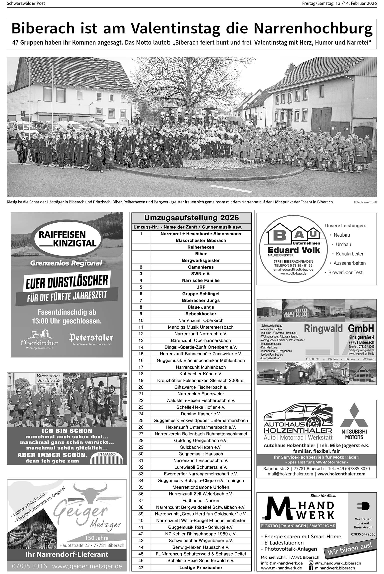 Dann folgen erstmals in einem großen Block die Biberacher Fußgruppen und Wagenbauer. „Biberach feiert bunt und frei. Valentinstag mit Herz, Humor und Narretei!“ heißt das diesjährige Motto. Mit großem Ideenreichtum werden die neun Biberacher Fasentgruppierungen dieses Thema zur Schau tragen. „Mit dieser Umzugsaufstellung wollen wir die örtlichen Gruppen noch besser in Szene setzen“, erklärt Oberzunftmeister Marco Schlieter. Einzig die „Lustigen Prinzbacher“ folgen erst am Ende des Umzugs, weil deren Wagen im Narrendorf stehen bleibt.