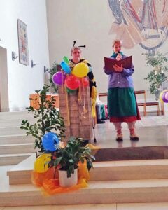 Nach dem Tagesgebet und der Lesung gab es eine Büttenrede, die durch herzhaftes Lachen immer wieder unterbrochen wurde. So durfte die Zuhörerschaft immer wieder ein gereimtes Wort ergänzen und nicht immer gelang das treffsicher. Anstatt nach einer Einladung „beim nach Hause gehen“ zu sagen „Es war schön“ reimten einige Kinder „Auf Wiedersehen“. Dieses und weitere Wortspiele wurden von den beiden Rednerinnen sogleich aufgegriffen und eingebaut. Immer wieder gab es Verwechslungen, die für Erheiterung sorgten.
