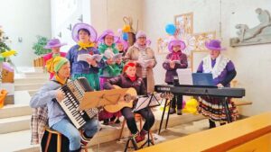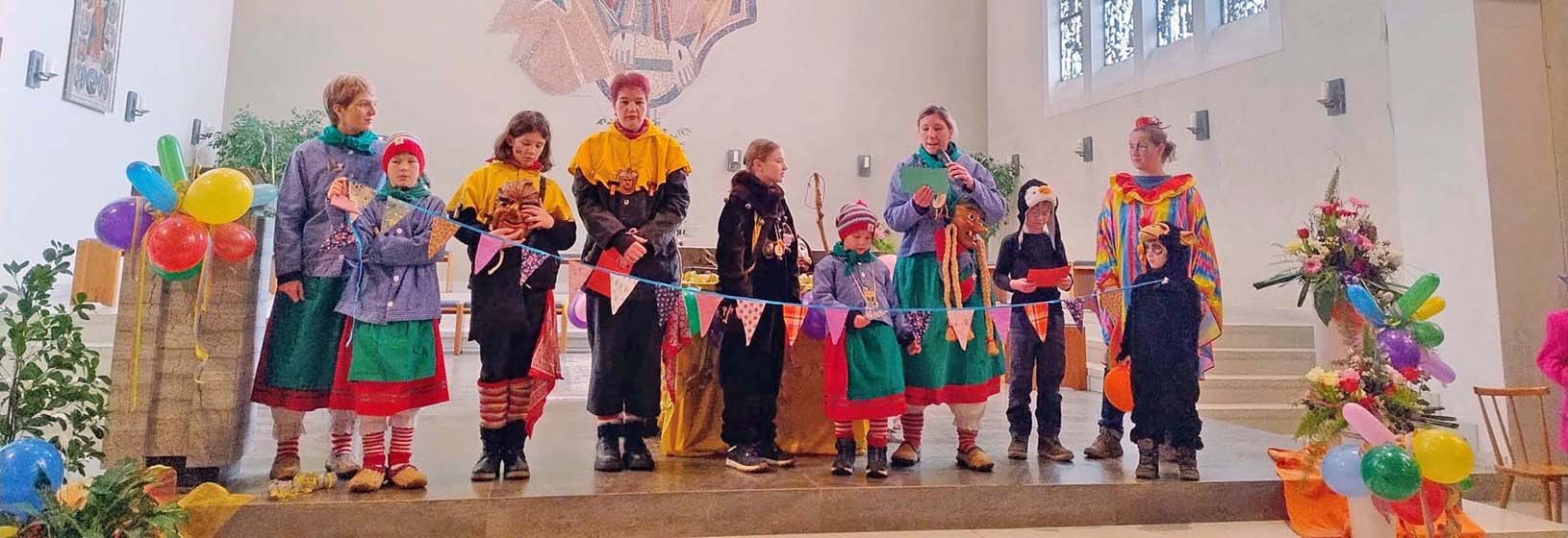 Bergwerksgeister, Biber und Reiherhexen folgten der Einladung genauso wie zahlreiche weitere verkleidete närrische Wesen. Aber auch Gottesdienstbesucher ohne Häs und Verkleidung reihten sich ein. Alle waren gespannt auf die Beiträge und freuten sich an der bunten Fastnachtsdekoration des Gemeindeteams rund um den Altarraum und an den Bänken, die den fröhlichen Charakter der Narrenmesse unterstrich.