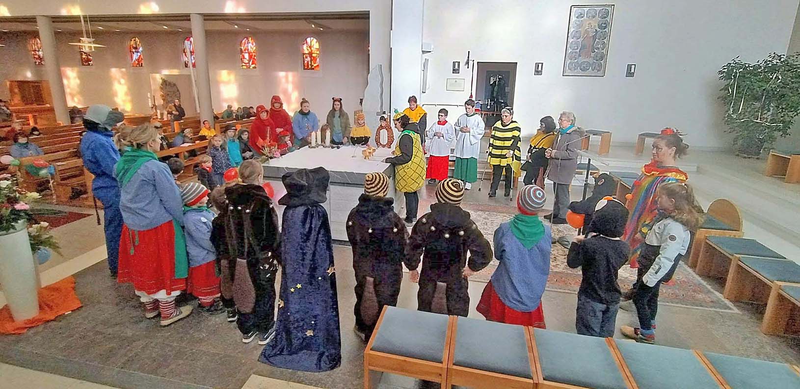 Die von Schulkindern vorgetragenen Fürbitten widmeten sich der Empathie und Aufmerksamkeit für die Mitmenschen, so dass alle beschützt und begleitet durch die närrischen Tage kommen und die Zeit darüber hinaus. Zum gemeinsam gesprochenen Vater Unser waren alle eingeladen, sich rund um den Altar aufzustellen. Viele kleine und große Kinder bildeten einen großen Kreis und sprachen das Gebet gemeinsam.