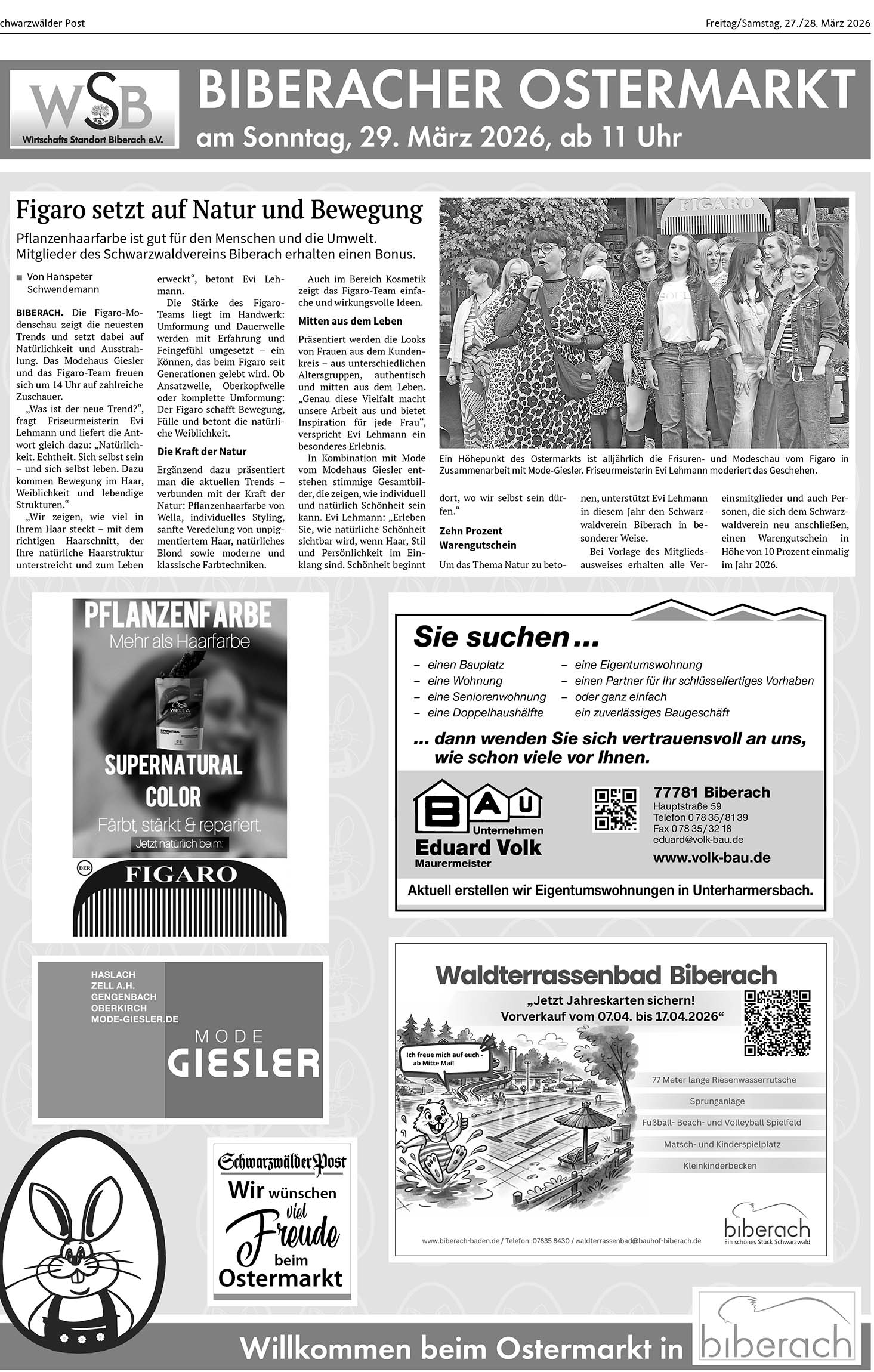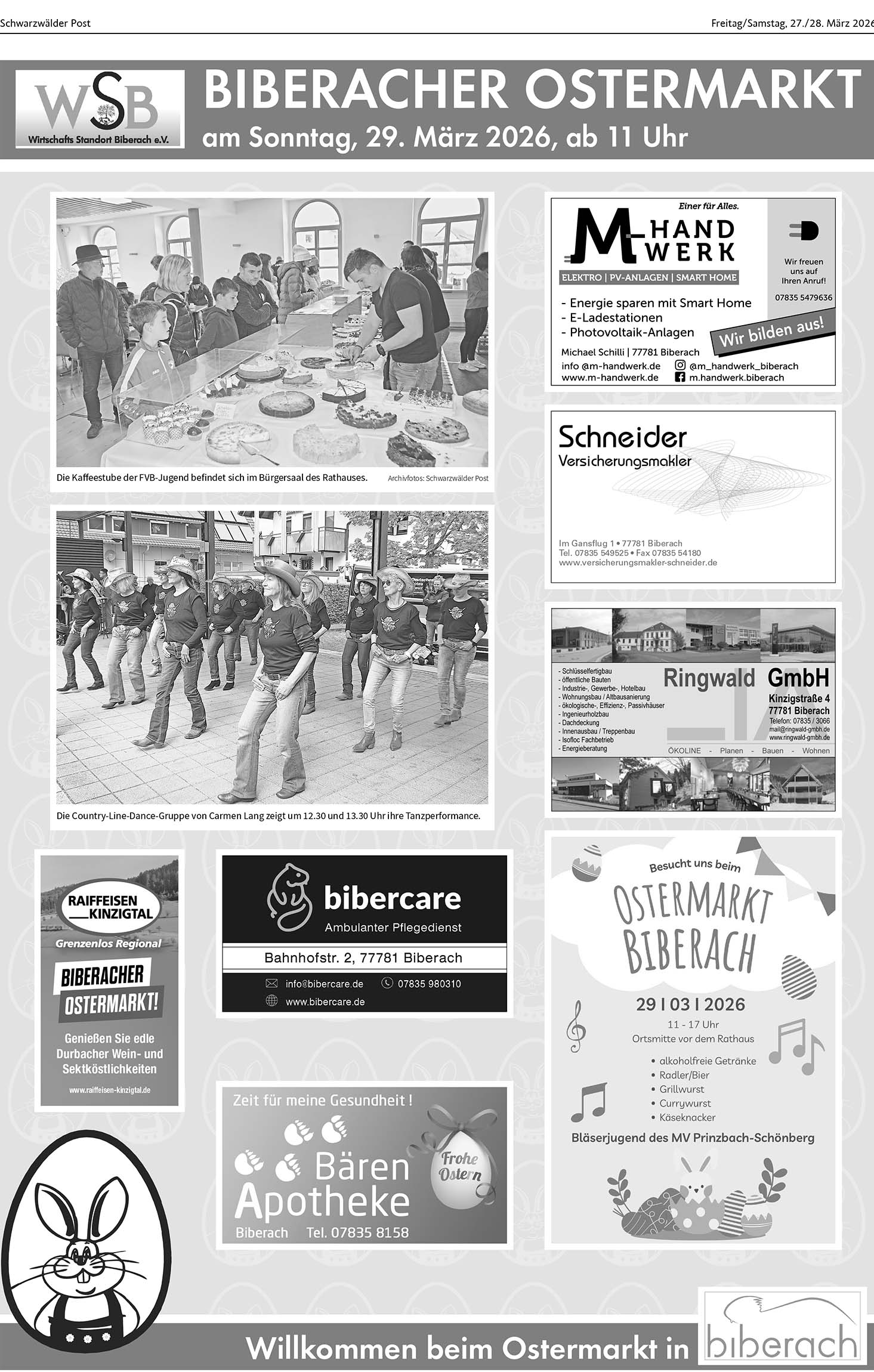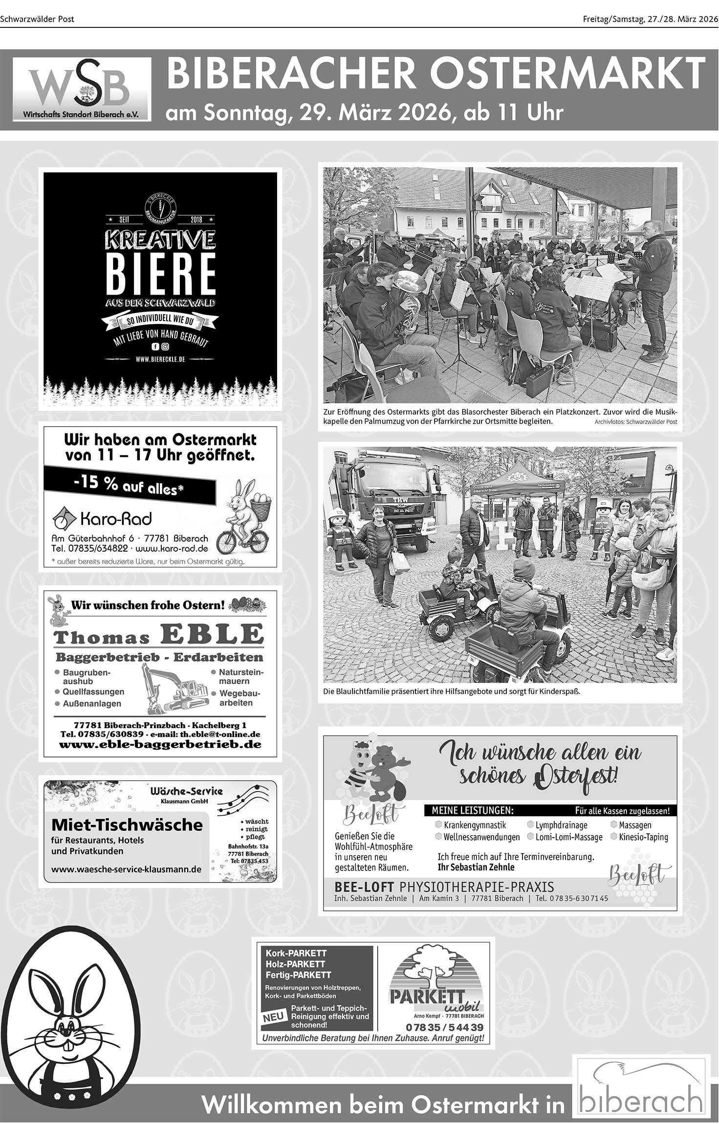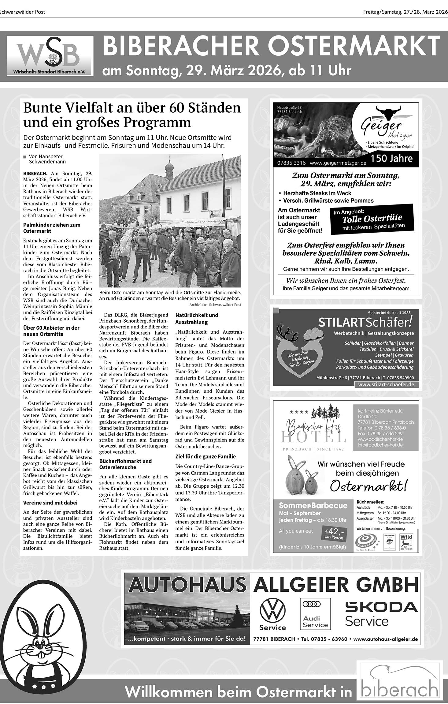 Am Sonntag, 29. März 2026, findet ab 11.00 Uhr in der Neuen Ortsmitte beim Rathaus in Biberach wieder der traditionelle Ostermarkt statt. Veranstalter ist der Biberacher Gewerbeverein WSB Wirtschaftsstandort Biberach e.V.