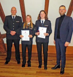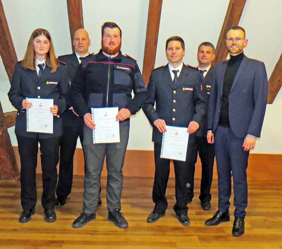 Zu Feuerwehrfrau beziehungsweise Feuerwehrmann wurden Eline Lehmann, Lena Moser und Janina Wussler befördert. Frank Becherer erhielt die Beförderung zum Löschmeister.