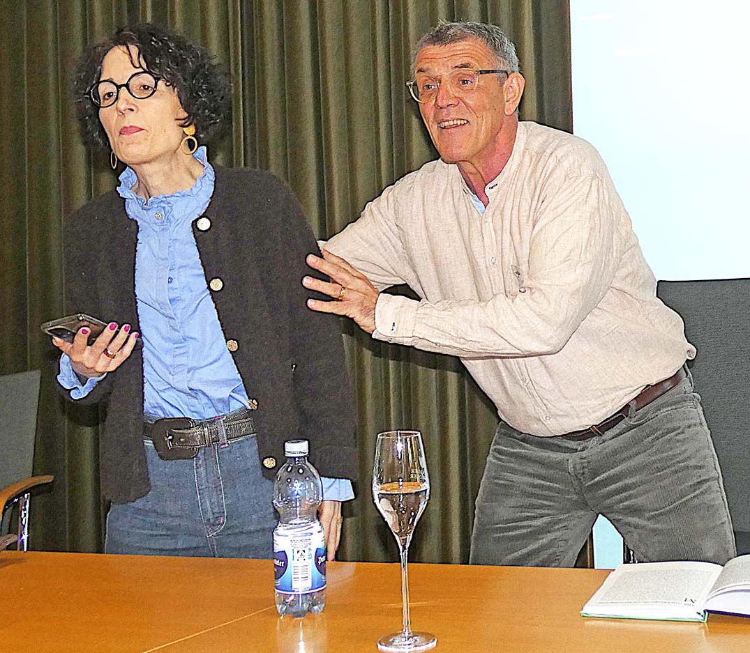 Schon für die ersten Lachsalven gesorgt hatte des Hämmes launige, stimmgewaltig-übersprudelnde Begrüßung unter anderem von Bürgermeister Jonas Breig sowie weiterer Ehrengäste. Und für all jene, die „schon immer wissen wollten, wie die Frau vom Hämme eigentlich aussieht“, stellte selbiger schließlich seine Frau Diana Dold vor. Noch saß diese scheinbar ungerührt am Büchertisch, während der Herr Gemahl den geneigten ZuhörerInnen erzählte, wie es zu dem Buch „De Hämme meint“ überhaupt gekommen ist.