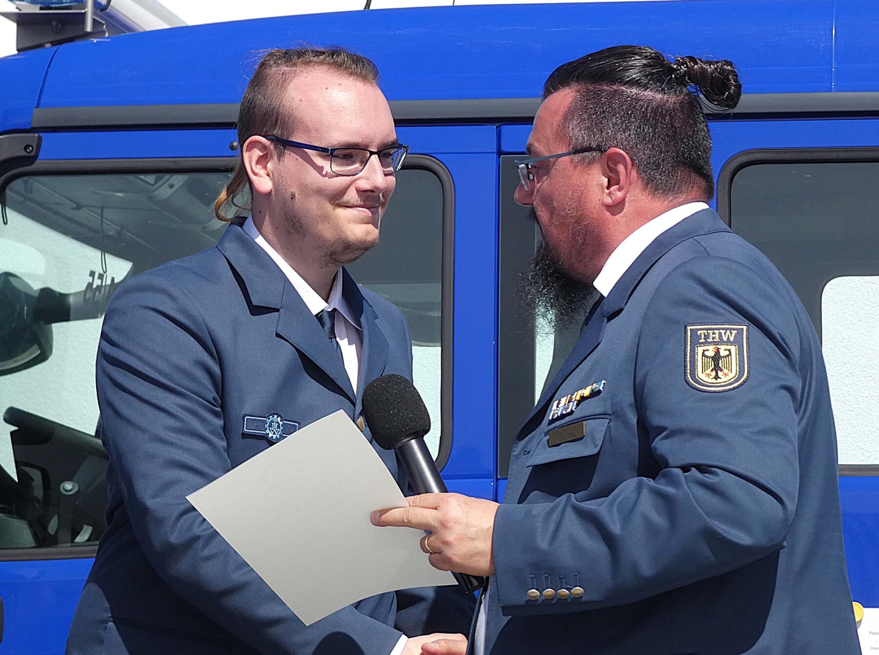 Ganz besondere Emotionen schwangen bei einer weiteren Ehrung mit. Hans Jörg Sorychta, von dessen fünf Söhnen drei im THW engagiert sind, überreichte seinem Sohn Linus mit inniger Umarmung eine Urkunde für zehnjährige Mitgliedschaft. „Ich habe deinen Weg von Anfang an miterlebt“, führte der Ortsbeauftragte am Mikrofon auf der Bühne aus, „und es macht mich als Vater wirklich stolz zu sehen, wie du dich entwickelt hast – mit Engagement, Verlässlichkeit und dem Willen, Verantwortung zu übernehmen.“