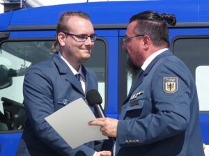 Das Helferzeichen in Gold wurde Jürgen Prinzbach und Reno Witzke verliehen. Seit ihrem THW-Beitritt im Jahre 2021 zeigen sie eine beispiellose Einsatzbereitschaft und Hingabe für die Organisation. Durch ihr unermüdliches Engagement bei zahlreichen Einsätzen und Übungen haben sie maßgeblich dazu beigetragen, dass der Ortsverband seine Aufgaben stets erfolgreich erfüllen konnte. Beide zeichnen sich durch eine beeindruckende fachliche Expertise aus, die sie sich durch zahlreiche Aus- und Weiterbildungen angeeignet haben.