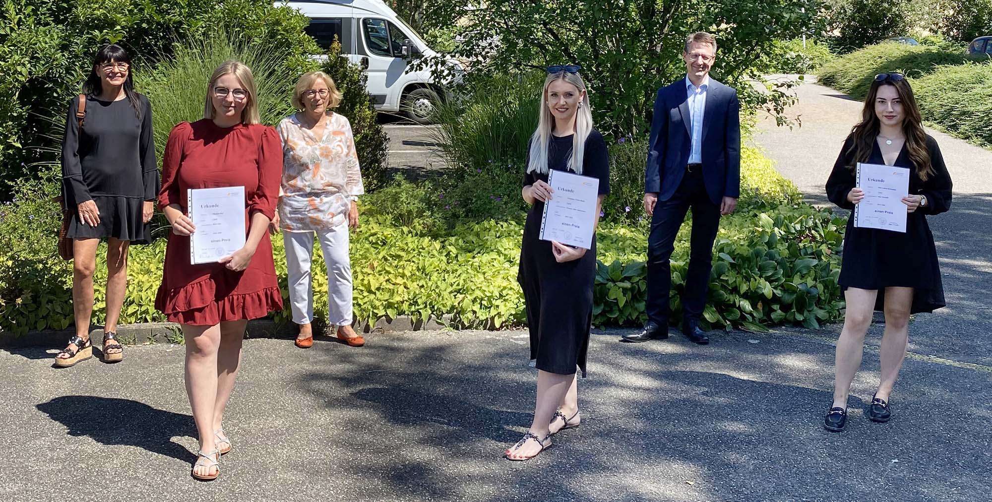 Pauline Ruf (vorne links) erzielte bei der Abschlussprüfung zur Friseurin an der Gewerblichen Schule Lahr sehr gute Prüfungsleistungen und wurde hierfür mit dem Preis der Wirtschaftsförderung der Stadt Lahr ausgezeichnet. Mit ihr freuen sich (hinten von links) Regina Schwendemann von ihrem Ausbildungsbetrieb Bliss City sowie Klassenlehrerin Ruth Bierer-Ruder und Schulleiter Bernd Wiedmann. Verliehen wird der Preis der Wirtschaftsförderung Lahr an den besten Absolventen, der in einem Lahrer Betrieb ausgebildet wurde. Ebenfalls Preise für ihre hervorragenden Prüfungsleistungen erhielten (vorne von rechts) Kim-Laura Schneider (Ausbildungsbetrieb Haar-Schmidt, Kehl) und Vanessa Claire Malik (Friseure Habermann, Offenburg).