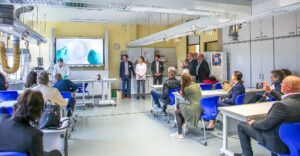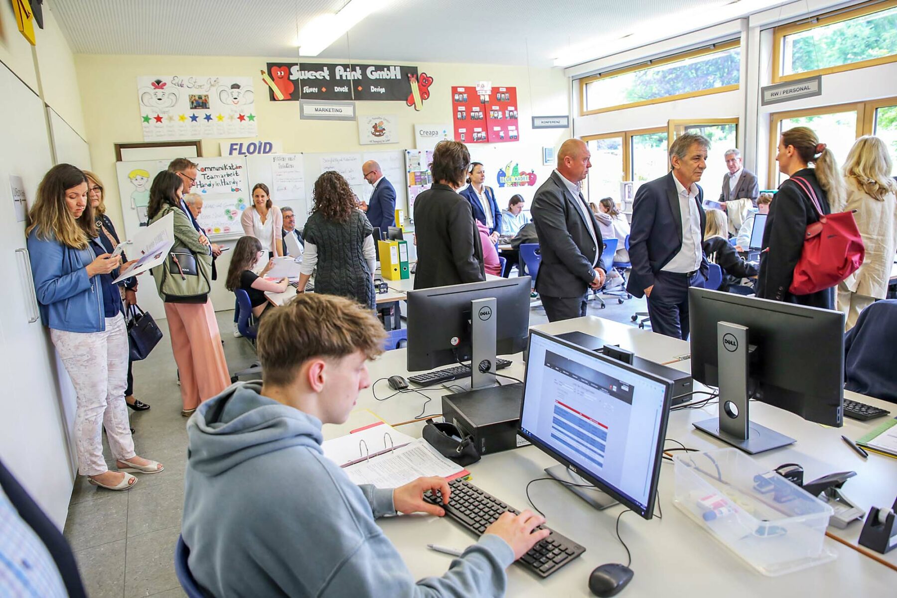 Während der 90-minütigen Führung erhielt die Delegation Einblicke in das vielfältige Bildungsangebot. Zuerst besuchten sie eine Übungsfirma, in der Berufskollegschüler Anfragen und Bestellungen bearbeiteten sowie Zahlungseingänge buchten. Anschließend demonstrierte Fachlehrer Martin Jehle im Chemiesaal einen Versuch mit Natrium, der über einen Visualizer an die digitale Tafel projiziert wurde. Die moderne technische Ausstattung der Schule beeindruckte die Gäste aus Bulgarien sehr.