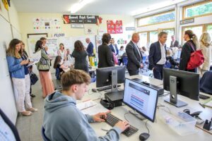 DV-Lehrerin Silvia Moog erklärte anhand eines Schülerprojekts die Chancen und Risiken des Einsatzes von Künstlicher Intelligenz im Schulalltag. Fotocollagen und eine Ausstellung im Foyer vermittelten einen Eindruck von den außergewöhnlichen Aktivitäten der Schule in den Bereichen Musik und Kunst. Besonders die Sprachenvielfalt – Englisch, Französisch, Spanisch, Russisch und Schwedisch – beeindruckte die Gäste.