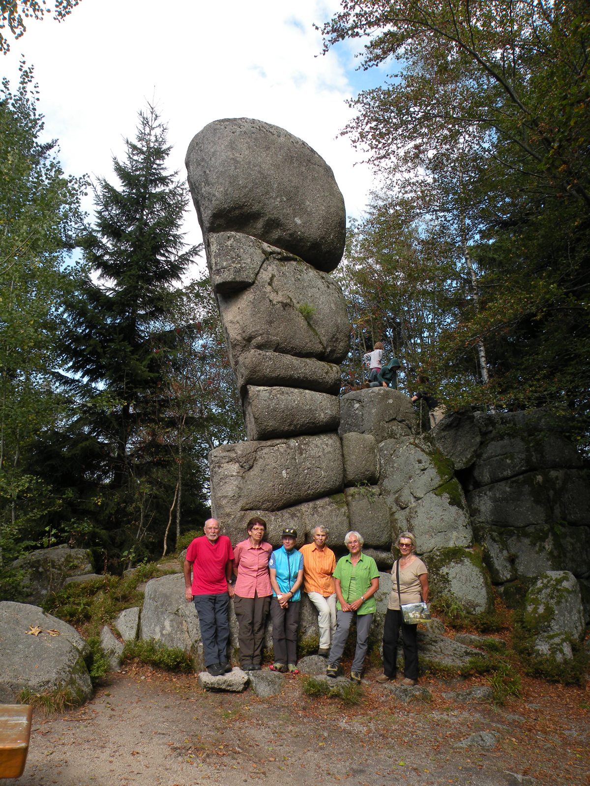 Vorbei am Stabhalterhof ging es steil aufwärts und bald hatte man die mittlere Talhöhe von ca. 593 m am Reichenbacher Eckle erreicht. Herrliche Ausblicke in das Tal mit dem vorderen und hinteren Zinken ließen die geologische Form eines »Y« erkennen. Das gegenüberliegende Braunhörnle (1134 m) hat der Sage nach einen großen See gespeichert, weil dort die Quellen nie versiegen. Der Hirtenweg führte weiter zum Satteleck, Obereck und Belghäusle. Über den Wälderpfad gelangte die Gruppe zu einem mystischen Platz mit dem Siebenfelsen (800 m), der vermutlich keltischen Ursprungs ist.