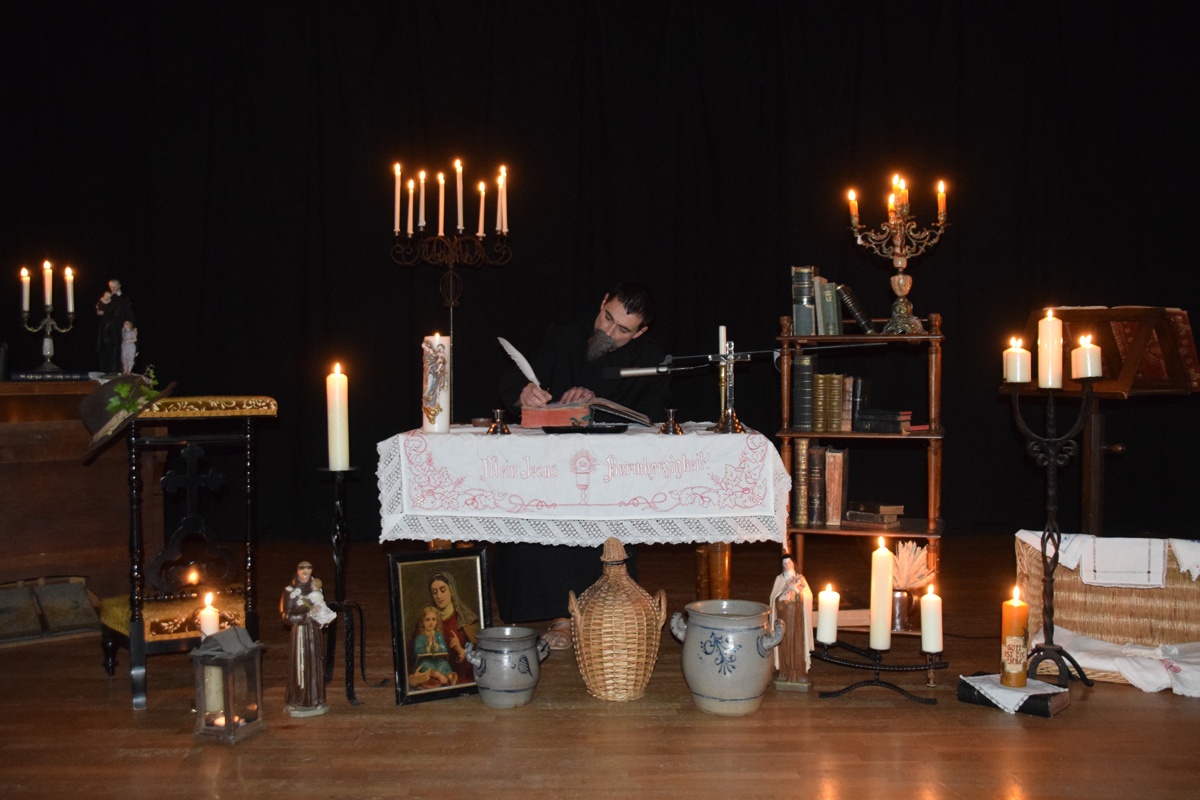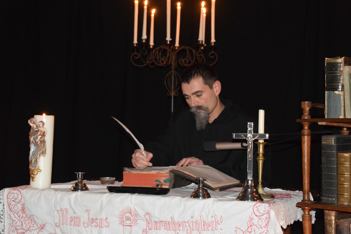 Der Altenwerksvorsitzende Herbert Vollmer freute sich, dass er unter den Gästen auch einige jüngere Personen begrüßen durfte, auch aus Nachbargemeinden waren Besucher gekommen. Die Frauengemeinschaft lud zunächst zu Kaffee und selbstgebackenen Kuchen ein. Danach wurde der Raum abgedunkelt und als der Bühnenvorhang aufging, zeigte sich eine beeindruckende Kulisse. Ein Studierzimmer wie vor dreihundert Jahren war zu sehen, beleuchtet von einer Vielzahl von Kerzen, ein großartiges Bild.