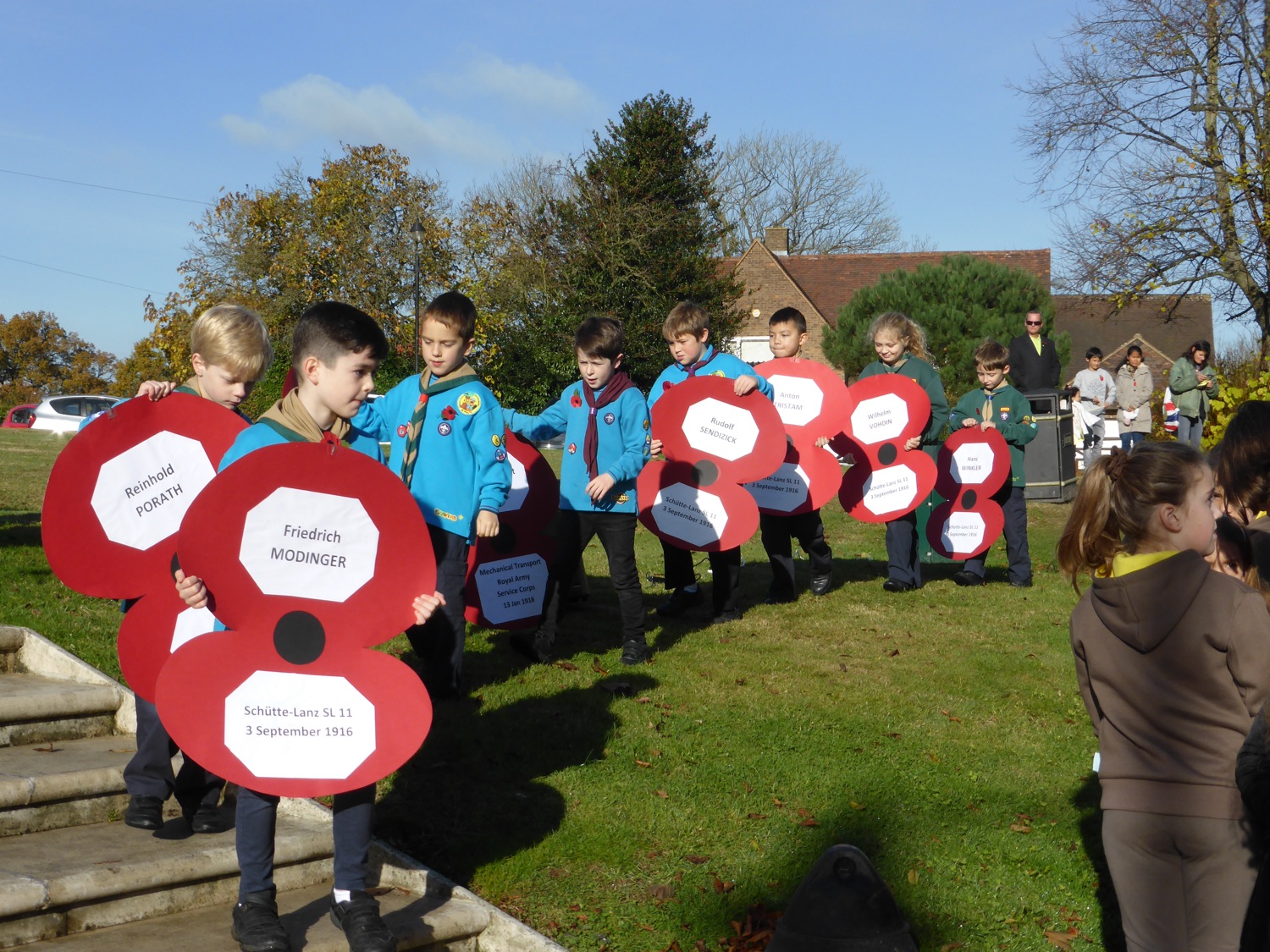 Zum Symbol wurden besagte Mohnblumen wohl – das sogenannte Rembrance Poppy – weil sie häufig auf Soldatengräbern wuchsen. »Nach ein paar einführenden Worten von Vikarin Rachel wurden von einem Gemeindemitglied zunächst die Namen der im ersten und zweiten Weltkrieg Gefallenen aus Northaw und Cuffley verlesen. Danach lassen Valentin und ich im Wechsel die Namen der 16 deutschen Soldaten vor, die am frühen Morgen des 3. September 1916 bei Cuffley abgeschossen und zu Tode gekommen sind«, erzählt Siggi Hodler. Parallel hielten Schüler und Schülerinnen in Pfadfinderuniform die Namen der genannten Toten in die Höhe – auf Schildern in Mohnblütenform. Die wurden dann in einer Prozession in die Kirche getragen und dort an einer langen Schnur aufgehängt.