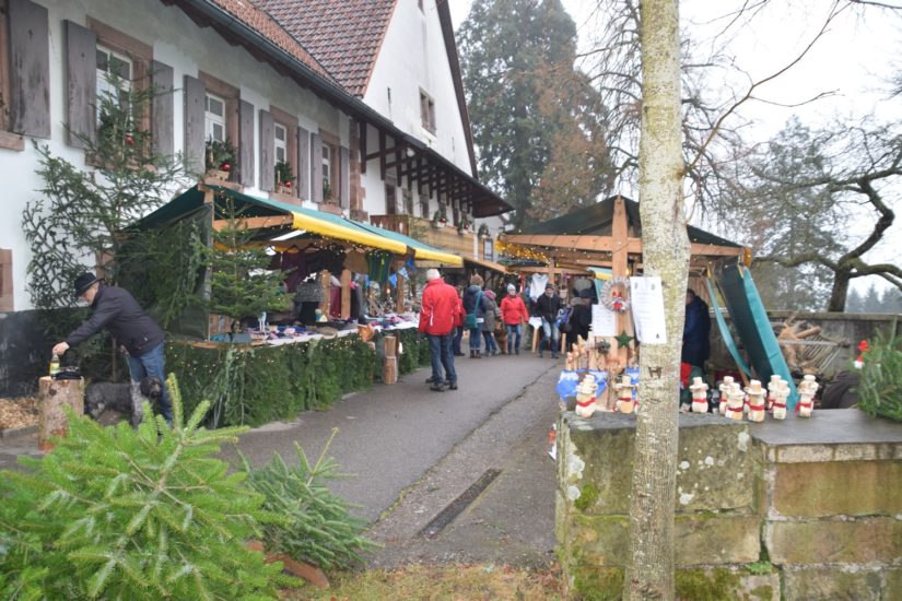 Die erwartungsvollen Besucher empfing ein Hofgebäude, das mit Tannenbäumchen und allerlei Dekorationen aus Baumstämmen weihnachtlich geschmückt war. Die Händler der neun Marktstände kamen aus der näheren Umgebung und boten ein breites Sortiment an schönen, handwerklich hergestellten, weihnachtlichen Dekorationsgegenständen an. Auch liebevoll genähte Kissen, handgestrickte warme Mützen und Schals waren bei der kalten Witterung gefragt. Wer noch keinen Weihnachtsbaum hatte, konnte sich einen schönen auswählen und erwerben.