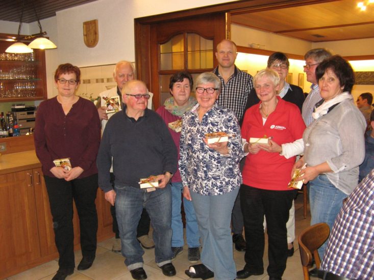 Erika Zimmermann nahm die Ehrung für die fleißigsten Probenbesucher 2016 vor. Sie wurden mit selbstgemachten Pralinen von Choko L belohnt. Vorne von links: Erika Zimmermann, Franz Giesler, Gretel Mark, Angelika Boschert, Walburga Gißler, dahinter von rechts Georg Lehmann, Gisela Oehler, Clemens Roth, Gertrud Spitzmüller und Franz Müller. Foto: Aydana Schwab