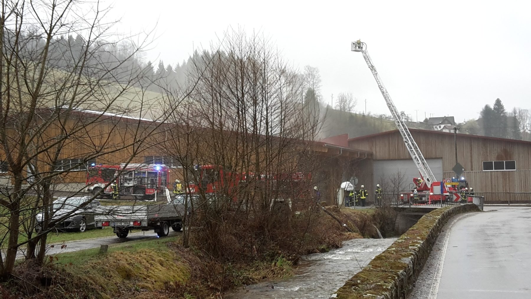 Die mittlerweile eingetroffene Drehleiter aus Gengenbach versorgte die Nordracher Wehr mit dem nötigen Löschwasser aus dem Talbach. Von oben konnte somit eine optimale Riegelstellung zur angrenzenden Lagerhalle mit Werkstatt und Technikräumen aufgebaut werden. Ein Wasserwerfer, gespeist durch eine weitere Nordracher Pumpe, kam Richtung Bärhag zum Einsatz.