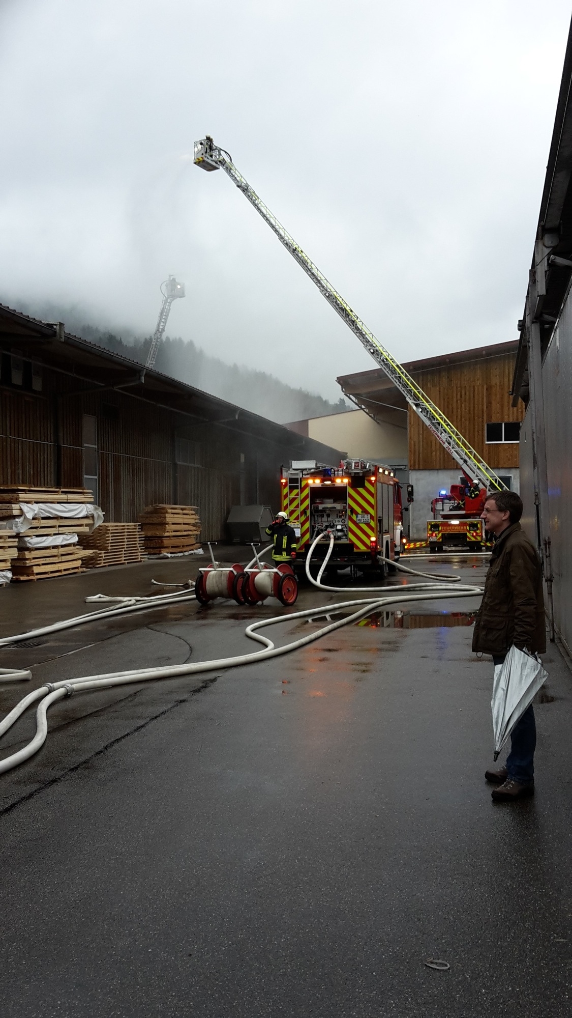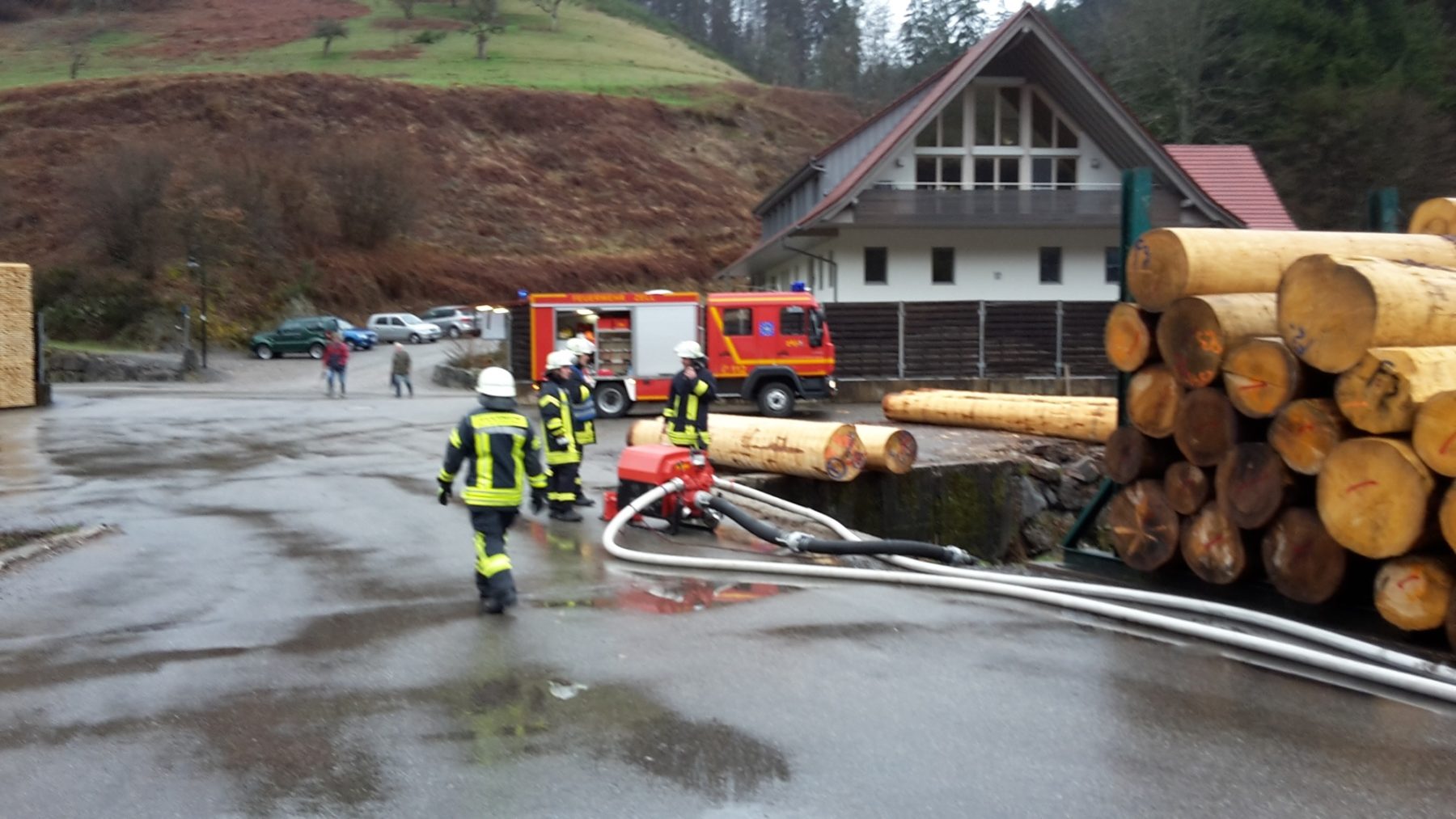 Der Geschäftsführer des Sägewerks, Manuel Echtle, zeigte sich in seiner kurzen Ansprache sehr beeindruckt von der Übung und der Schlagkraft der Wehren und des DRK. Er erläuterte kurz die neue Sprinkleranlage, welche so ausgelegt sei, dass sie 90 Minuten lang an allen Sprinklern Wasser abgeben kann. Die Vorschriften bestimmten zudem, dass das auch gewährleistet sein müsse, wenn gleichzeitig an drei Stellen des Betriebsgeländes ein Brand ausbrechen würde. Dazu müsse ein Löschwasservorrat von 800.000 Litern in einem Becken vorgehalten werden. Eine elektrisch betriebene Pumpe mit einem Fördervolumen von 8000 l/min versorge dabei die Anlage. Bei Stromausfall übernehme dies sofort eine parallel aufgestellte dieselbetriebene Pumpe mit der gleichen Leistung.