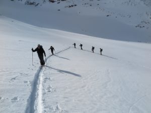 Die Skitourengeher beim Aufstieg zur Rauhkopfscharte. Foto: Georg Fletschinger