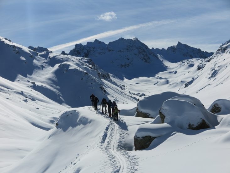 Mit viel Sonnenschein in dieser Woche konnten die unterschiedlichsten Aktivitäten unternommen werden. Gleich nach Ankunft wurde von den Skitourengehern der Hennekopf (2704m) bestiegen. Die Schneeschuhwanderer bestiegen die Bielerspitze (2545m). In den nächsten Tagen wurden noch viele schöne Schneeschuhtouren über die Großvermuntalpe, zur Wiesbadener Hütte und hinauf zur Zollhütte im Kromertal unternommen. Mit den Langlaufskiern ging es flott durchs Paznauntal hinunter nach Wirl und von dort auf der Skisafari in großer Runde über den Kops-Staussee durchs Ganifertal bis nach Partenen hinunter. Die Skilangläufer konnten auf der hochgelegenen Dammloipe und der Höhenloipe ihre Runden drehen.