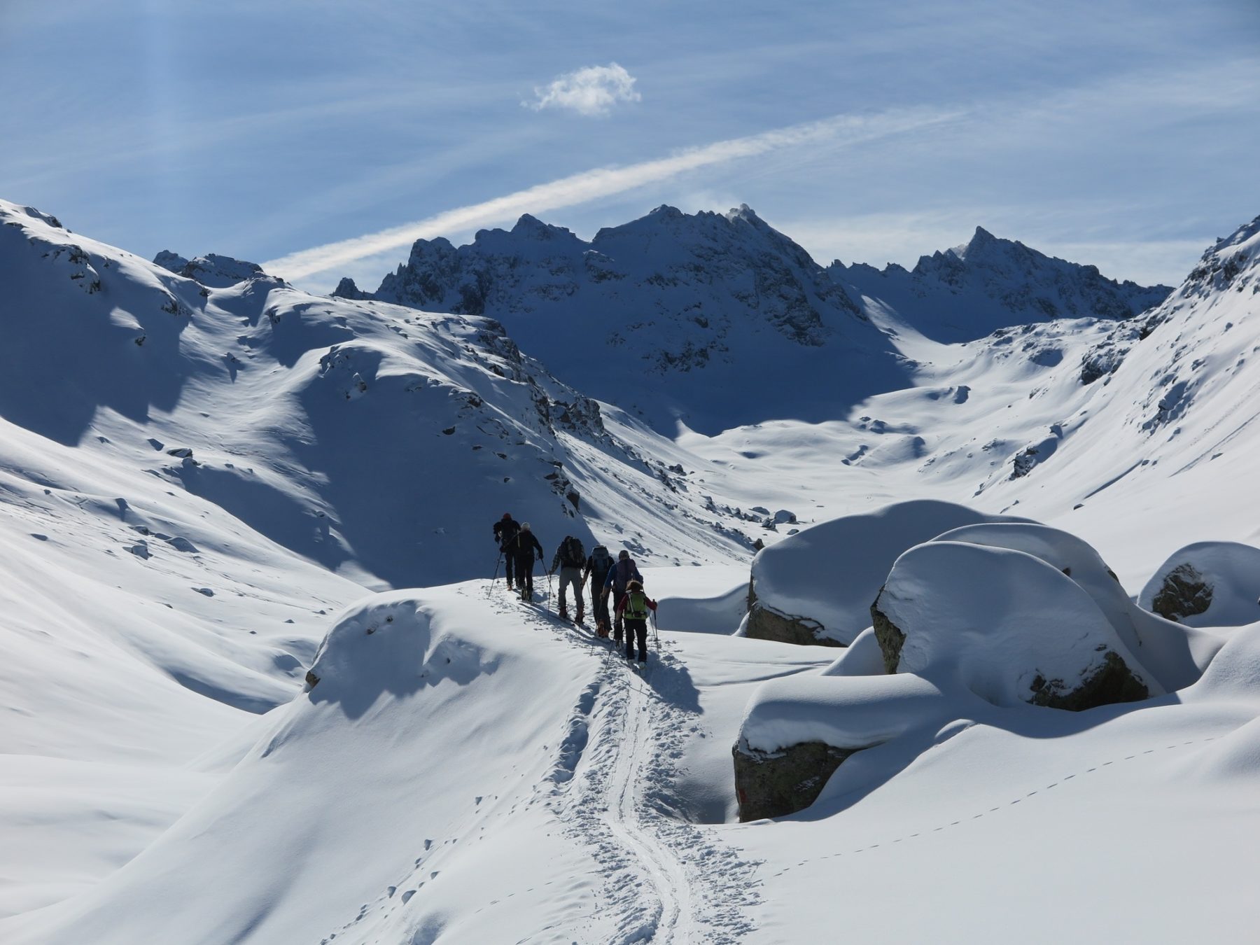Für die Skitourengeher war es eine Tourenwoche wie sie nicht schöner sein konnte. Mit fünf Touren bei guten Schneeverhältnissen waren alle mehr als zufrieden. Mit der Besteigung der Schneeglocke (3223m) im Klostertal und der Dreiländerspitze (3197m) im Ochsental wurden hohe Berge bestiegen. Weitere Touren führten durchs Bieltal zur Rauhkopfscharte (2991m) und am nächsten Tag ging es steil hinauf durchs Verhupftäli zur Litznerscharte (2737m) mit langer Abfahrt hinunter durchs Kromertal zum Vermunt-Staussee. Die Winterwanderer erkundeten die Gegend rund um den Silvretta-Stausee.