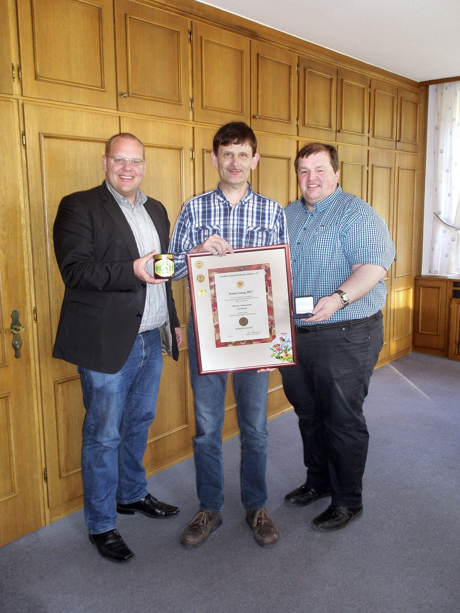 Anlässlich des Badischen Imkertages in Eberbach wurde dem Nordracher Imker Martin Hansmann bei der Honigprämierung 2017 für hervorragende Leistungen bei der Gewinnung und Behandlung von Honig vom Vorsitzenden des Landesverbandes Baden Klaus Schmieder zum dritten Mal in Folge die Medaille in Gold mit höchstmöglicher Punktezahl verliehen.