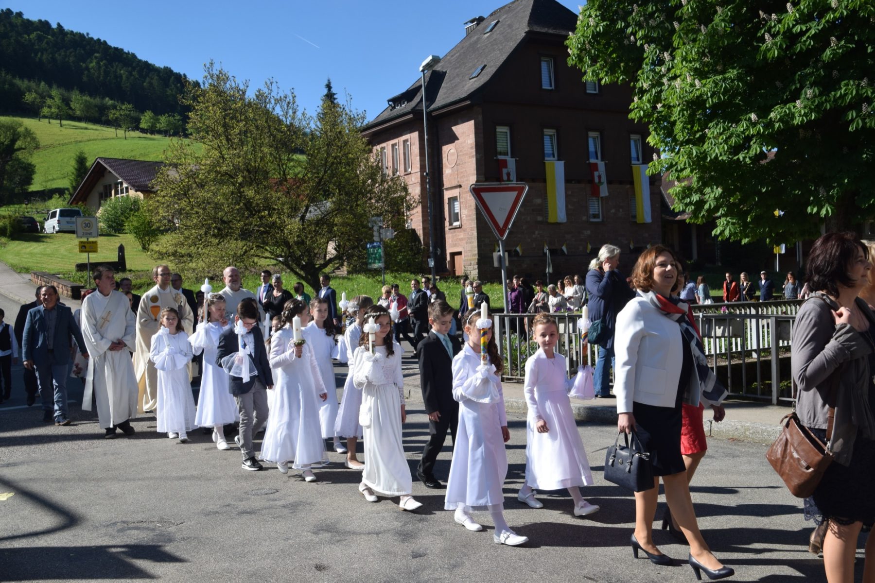 Am vergangenen Sonntag feierten dreizehn Kinder, zehn Mädchen und drei Jungen, das Fest der Heiligen Kommunion. Die Trachtenkapelle Nordrach holte die Kinder, Kooperator Rainer Warneck, Gemeindereferent Markus Kaupp-Herdick und Bruder Pirmin sowie die Angehörigen am Pfarrheim ab und geleitete sie in die festlich geschmückte Kirche.