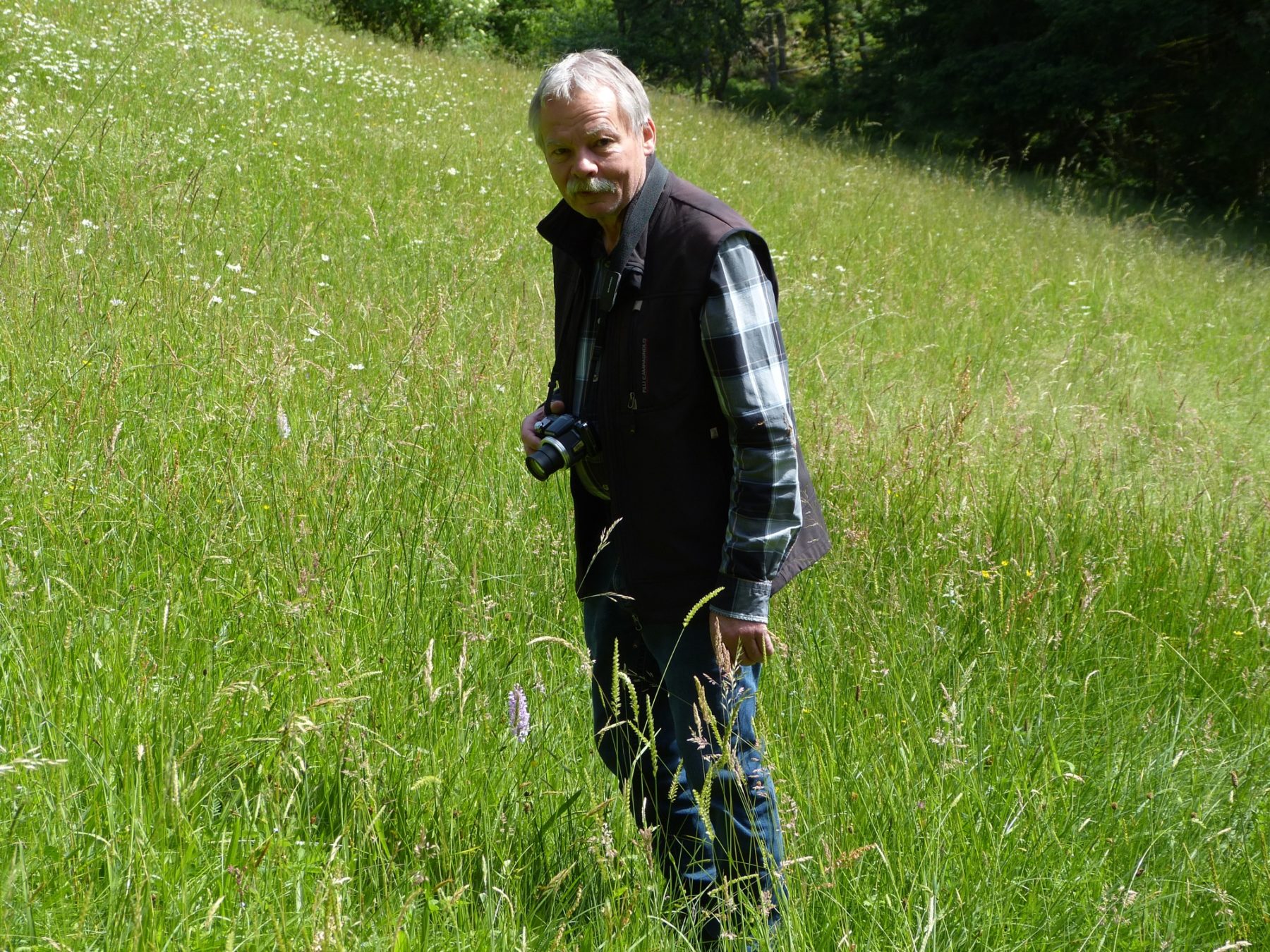 Schmale Spuren im Gras stammen von Rehen. Sie fressen Baumschösslinge und sorgen auf diese Weise mit dafür, dass der Wald die längst unter Flora-Fauna-Habitat-Schutz stehende Wiese nicht in Beschlag nimmt. Aus demselben Grund wird das Gelände beweidet, extensiv jedoch und erst dann, wenn die Orchideen verblüht sind und ihre Samen verteilt haben. Fleißig zirpen die Grillen, Heuschrecken springen, sogar die ganz seltene europäische Gebirgsschrecke ist dem Hobbyfotografen hier bereits vor die Linse gekommen. Zigtausende seiner Fotos habe er schon ins Netz gestellt, »um der Welt zu zeigen, wie schön Nordrach ist. Das weiß der Bürgermeister glaub‘ ich gar nicht«, schmunzelt Siggi Erdrich und erzählt von einer internationalen Fangemeinde. »Wegen der Bilder sind schon Leute aus Amerika und Israel extra hierher nach Nordrach gekommen, um sich unsere wunderschöne Natur und Landschaft anzuschauen.«