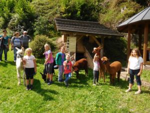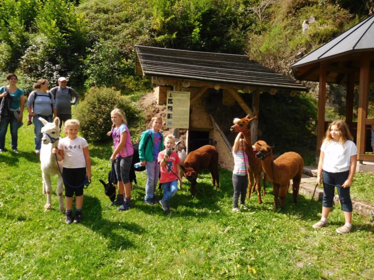 in die Hände gelegt. Die Wanderung führte entlang des schmalen Wanderwegs im Moosbachtal in Richtung Kornebene. Aufgrund der süßen Alpakas war der Anstieg für die Kinder ein Leichtes.