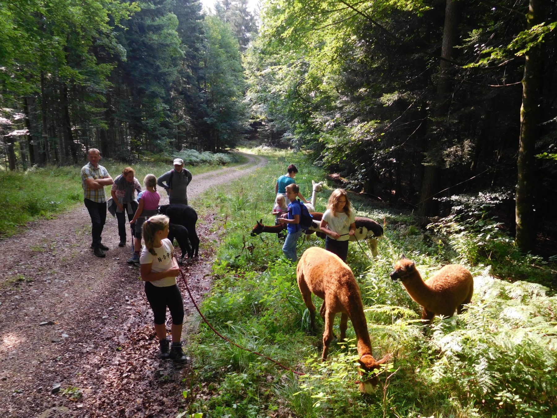 Im Rahmen des Nordracher Sommer-Ferienprogramms wanderten sechs Kinder zusammen mit ulkigen Alpakas entlang des Moosbachtals zur Kornebene.