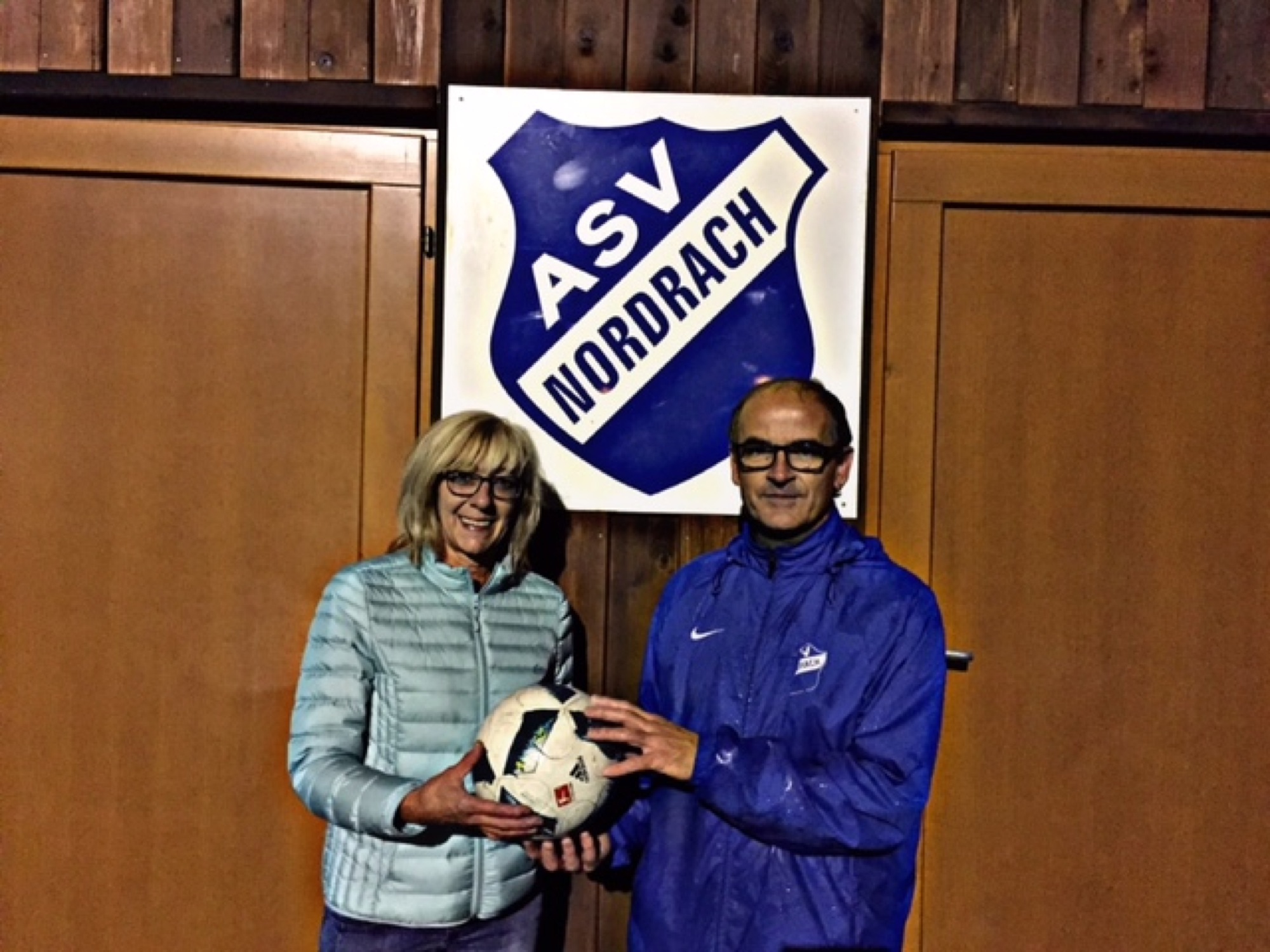 Der Spielball für das kommende Oktoberfest-Wochenende des ASV Nordrach gegen den FSV Altdorf II wurde von »Hair Mobil« Angelika Späth gespendet. Seit vielen Jahren ist die Friseurin schon mit dem ASV verbunden. Ihr Sohn Björn ist ein leidenschaftlicher Fußballer und hat jahrelang für seinen Heimatverein gespielt. Für Angelika war und ist es immer eine Ehrensache, den Verein bei Festen mit Arbeitseinsätzen zu unterstützen. Den Spielball übergibt sie unserem Trainer Thomas Granzow. Sie wünscht ihm und seinem Team viel Glück im anstehenden Spiel und hofft, dass endlich der Knoten platzt und der ASV wieder siegt. Foto: Selina Späth