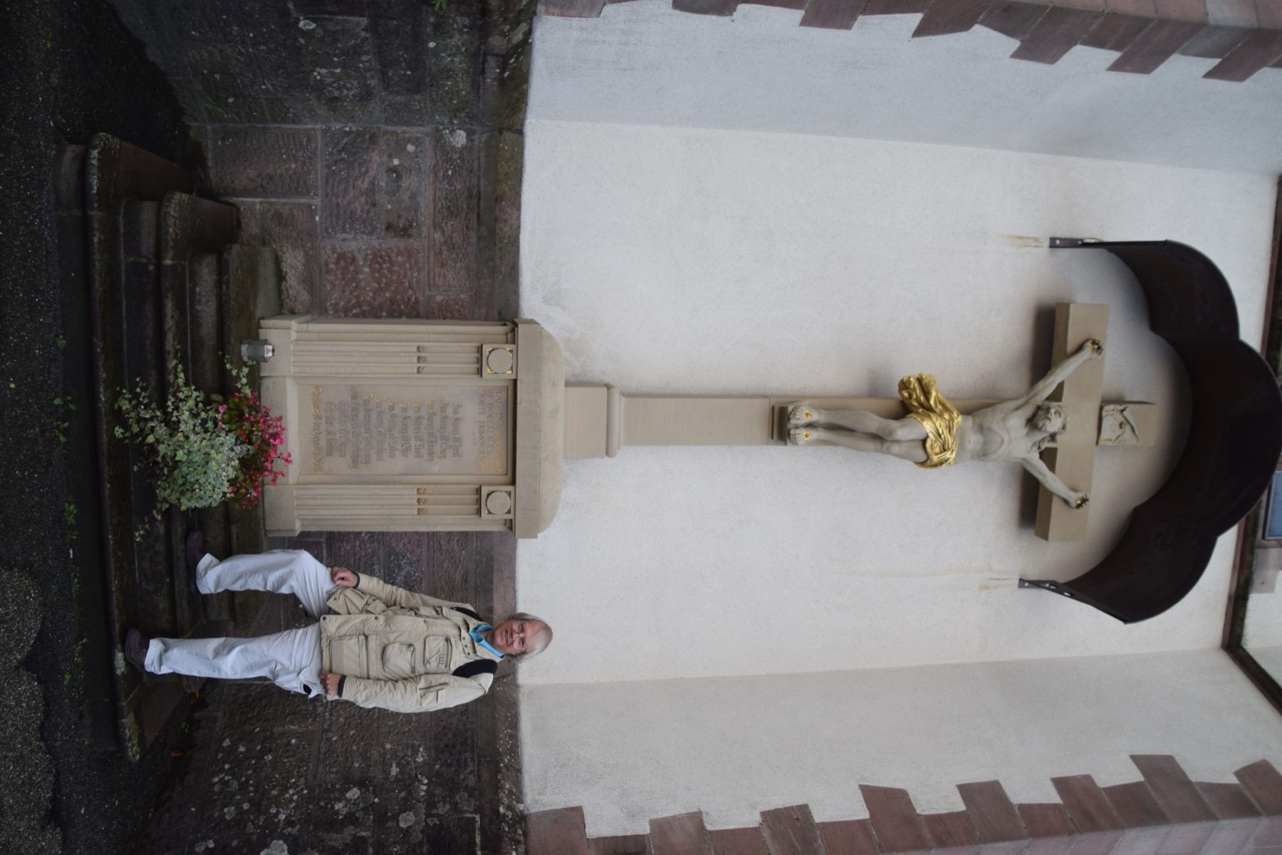 Randy Baehr vor dem Käshammerkreuz an der Nordracher Pfarrkirche. Ein Verwandter seines Vaters, Johannes Käßhammer, hat dieses Kreuz im Jahre 1784 aufstellen lassen.