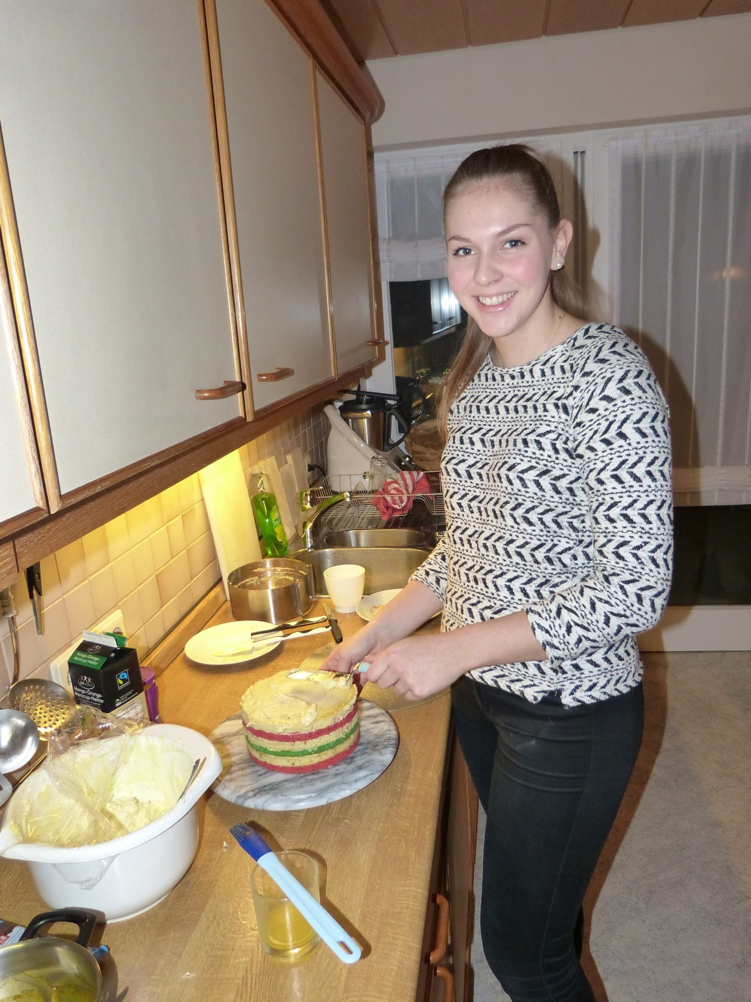 Für ihre spezielle Weihnachtstorte hat Alisa nun acht Rührteigböden einzeln abgebacken, jeweils zwei davon in den Weihnachtsfarben rot und grün eingefärbt. Aus der Mitte der Böden sticht sie Kreise aus und setzt alles unterschiedlich wieder zusammen, mithilfe von Frischkäse-Buttercreme als »Kleber«. Dann kommt das Aufeinandersetzen der Böden an die Reihe – genau bündig und ohne dass die Kreise aus den Ringen fallen dürfen. Das erfordert Übung, und die hat Alisa. »Ich habe schon immer gerne gekocht und gebacken, das machen wir in der Familie eigentlich alle gerne«, meint das Mädchen, das als weiteres Hobby im Musikverein Querflöte spielt. Und das sie sich hätte vorstellen können, zwecks Berufsausübung das Konditorhandwerk zu lernen – wären da nicht die abschreckenden Arbeitszeiten.