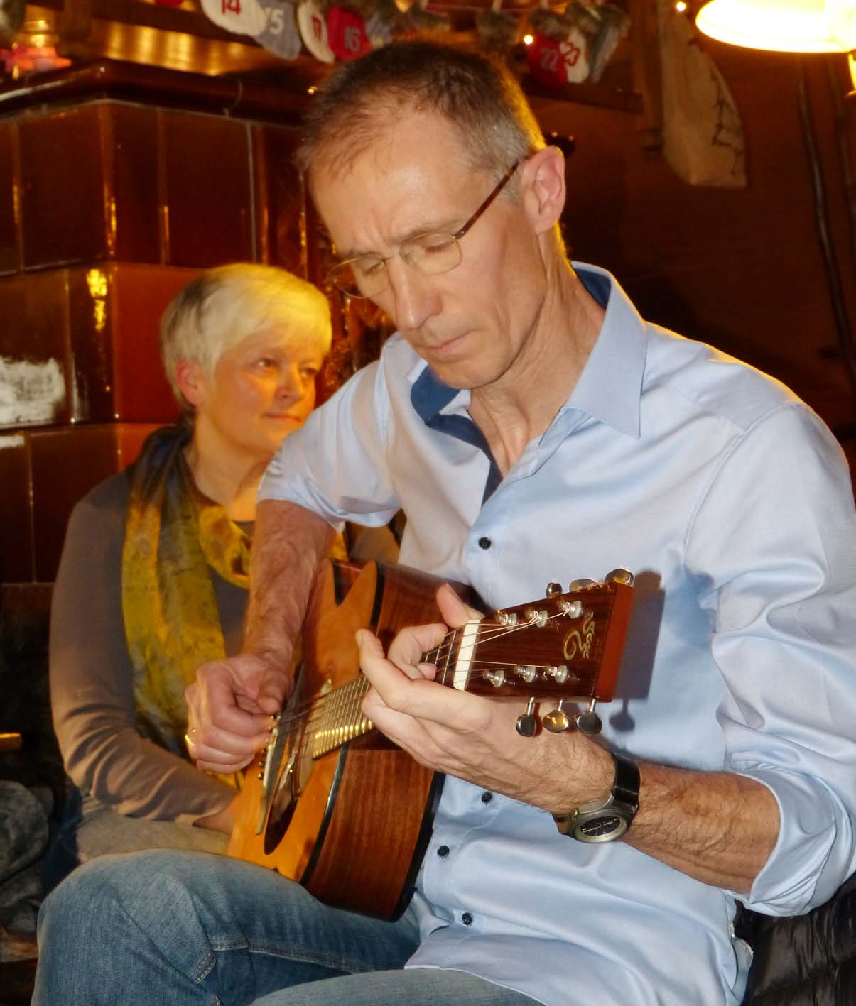 Ebenfalls viel Applaus erhielt Roland Jäckle aus Hausach, der die Lesung mit seinem Gitarrenspiel begleitete. Zum Dank erhielten beide Akteure von Stefanie Vollmer eine große Flasche Nordracher Moospfafflikör – beerig-fruchtig und umso passender, als Urs Faes auch den Moospfaff als ortsspezifische Sagengestalt subtil in sein Romangeschehen mit eingewoben hat.
