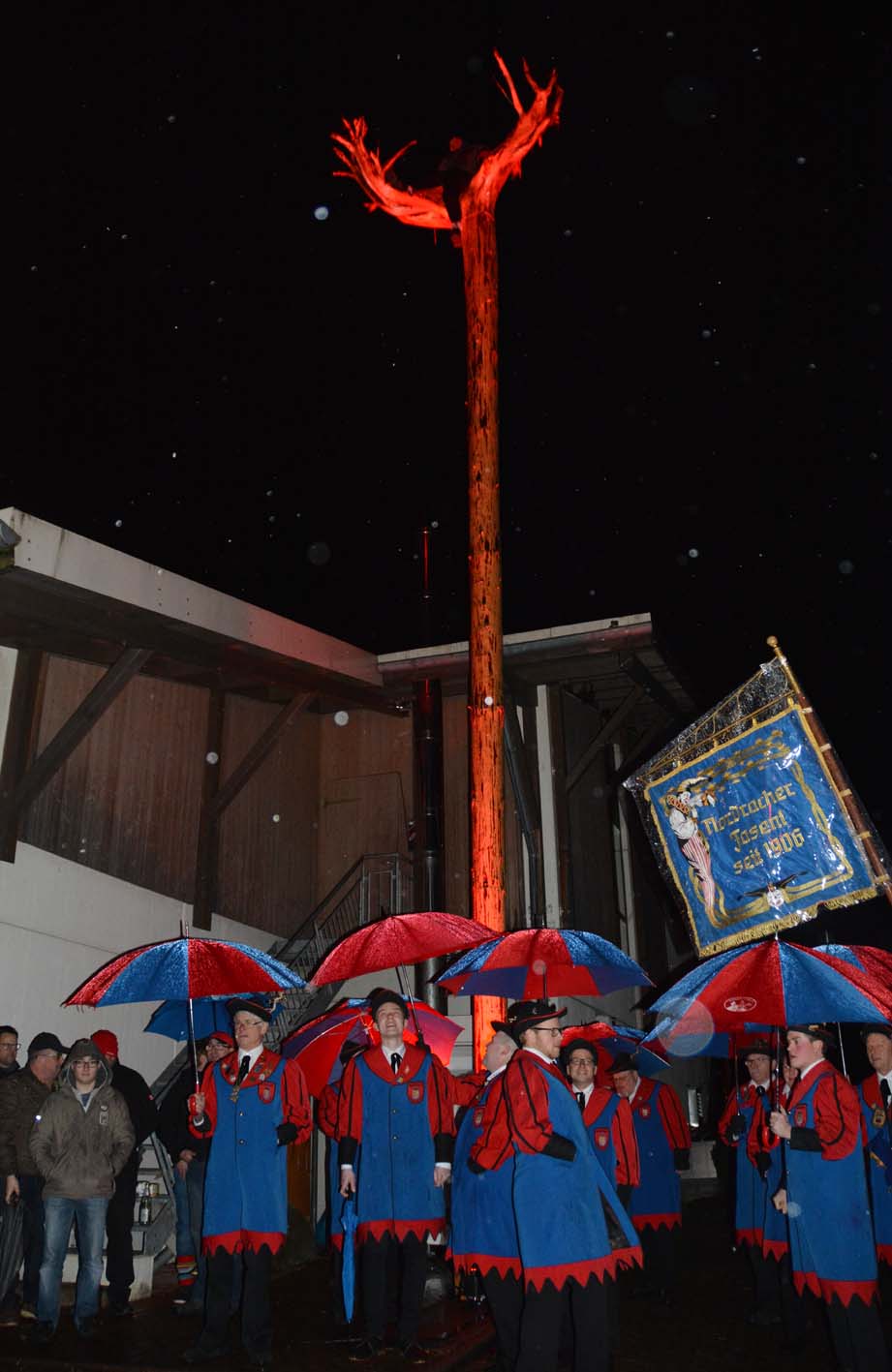 13 Meter hoch und zwei Tonnen schwer: mächtig verkündet der Narrenbaum mitten im Dorf den 44. Geburtstag der Narrenzunft. Aus Sicherheitsgründen wurde der Baum bereits vor einer Woche unter der Leitung der Freiwilligen Feuerwehr neben der Hansjakob-Halle aufgestellt. Unter dem rot angestrahlten Narrensymbol versammelten sich die Nordracher Obernarren und die Glashansel während die Piraten-Kapelle den Narrenmarsch spielte. Trotz des strömenden Regens überwog die Vorfreude auf die Jubiläums-Fasent.