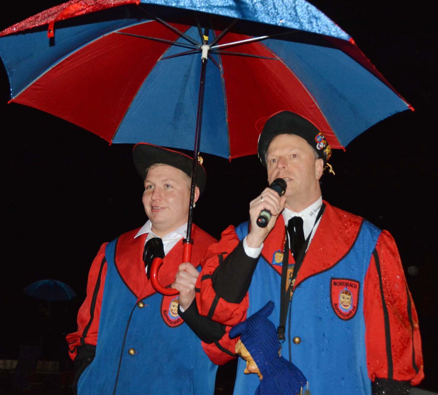 »Die Fasent risst uns alle mit«, verkündete Zunftmeister Rolf Stiewe (rechts), gut beschirmt von Narrenrat Mathias Walter (links).