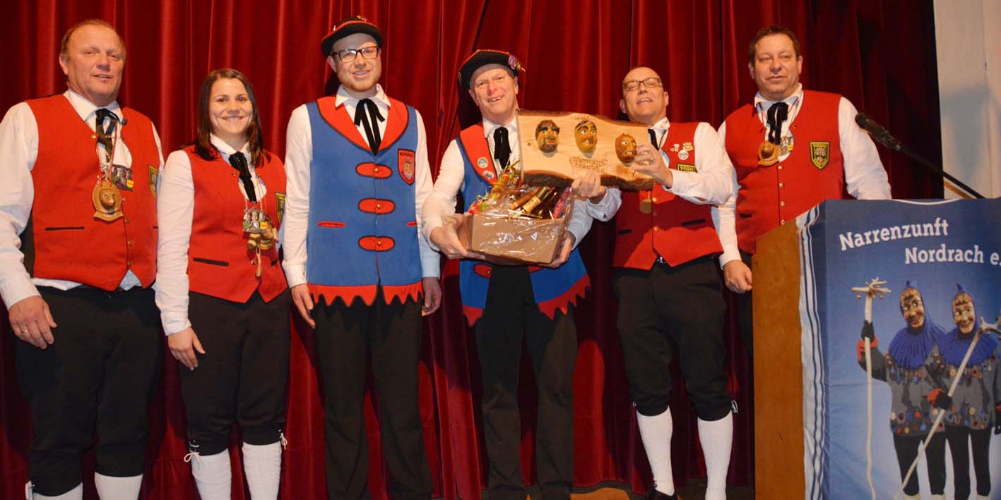 Die Glückwünsche der Gemeinde Nordrach überbrachte Bürgermeister Cars­ten Erhardt. Mit Kameradschaft, Freundschaft und Zusam­menhalt werde im Ort die Narretei gelebt und er ziehe vor allem seinen Hut, was die Zunft auch für die Gemeinde tut, lobte Bürgermeister Erhardt in seinem Geburtstagsgedicht. Er erinnerte an den ersten Zunftmeister Alfons Doll, seinen Nachfolger und heutigen Ehrenzunftmeister Andreas Oberle, an Josef Bruder und an Rolf Stiewe, die an vorderster Stelle die Narrenzunft führen und geführt haben. Gemeinsam mit seinem Stellvertreter Günter Eble und Gemeinderat Erwin Decker überreichte er der Narrenzunft eine prächtige Geburtstagstorte und einen Gutschein.