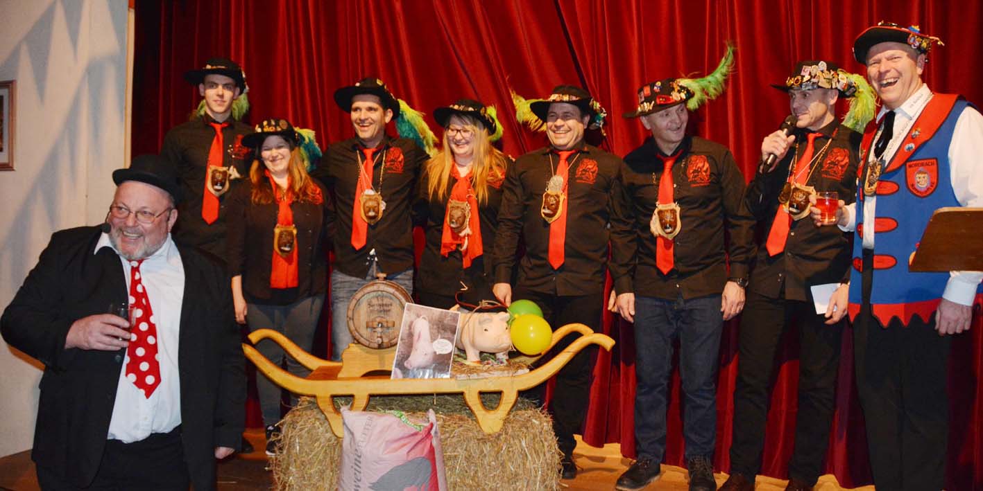 Damit das närrische Leben etwas leichter geht überbrachten auch Karl Gallus für die Sparkasse Haslach-Zell und Stephanie Boschert für die Volksbank Lahr ihre Jubiläumsspenden. An der Perlenkette der Narrenzünfte sei die Nordracher Zunft ein wahrer Diamant, gratulierte der Zeller Ehrenzunftmeister Berthold Damm und hatte direkt von der Schlachtbank einen prall gefüllten Saumagen mitgebracht – und erinnerte damit auch an den gemeinsam erlebten Narrenspaß.