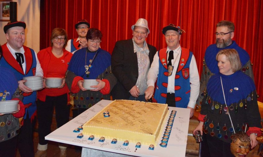 Süße Stärkung für die Gäste des Festbanketts und die Nordracher Narren: Bürgermeister Carsten Erhardt (Mitte) überreichte eine prächtige Geburtstagstorte, die er gemeinsam mit Zunftmeister Rolf Stiewe anschnitt.