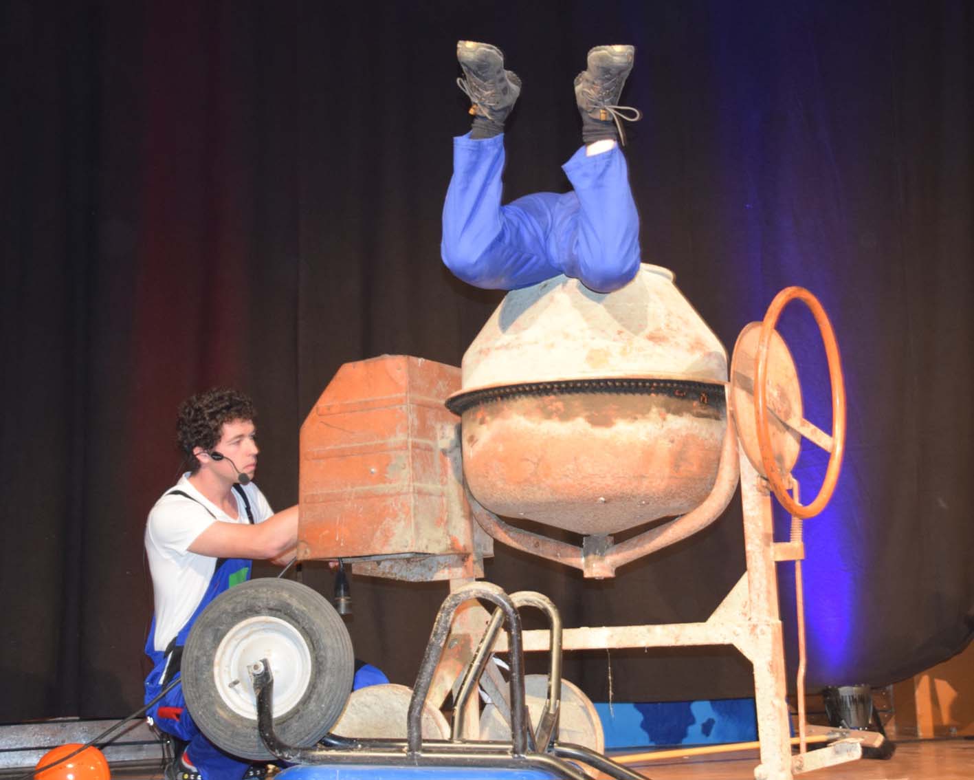 Dann erfuhren die Zuschauer, warum es beim Rathausumbau nicht vorangeht. Auf der Baustelle übertrafen sich die Bauarbeiter gegenseitig an Ungeschicklichkeiten und zum Höhepunkt landete Bauarbeiter Christof Walter kopfüber in einer Betonmaschine. Da konnte Magdalena Späth von der Bauaufsicht nur feststellen, »eine Baustelle voller Deppen!«
