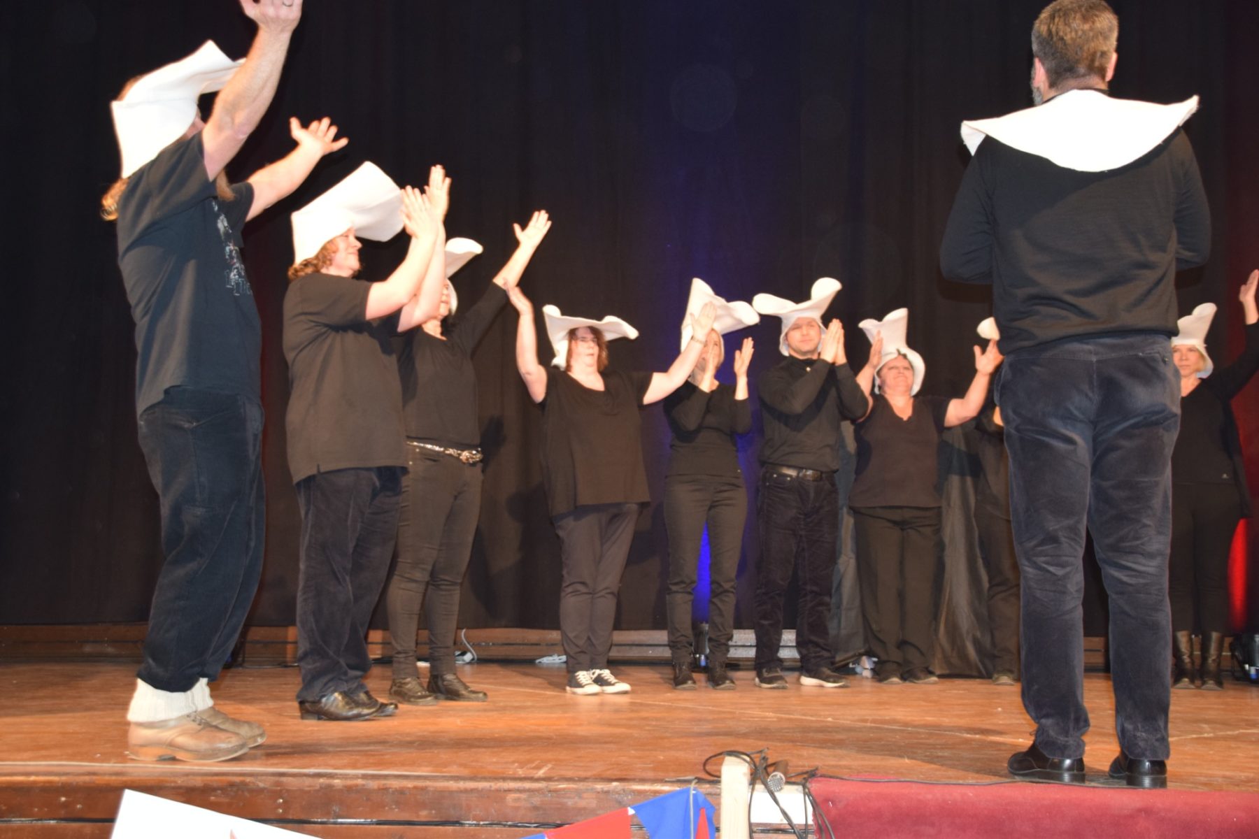 Die Gruppe HPC, der Hansel-Projekt-Chor, spielte »Ein Hut für alle Fälle«. Sie formten ihre weißen Kragen immer wieder um und benutzen sie in vielfältiger Art und Weise, auch als Kopfschutz, Nonnenhaube, Rettungsring, Paddel, Babylatz oder Napoleonshut. Zu jeder Szene wurde ein passendes Lied gespielt. Ein großartiger Vortrag, der sehr viel Applaus erhielt.
