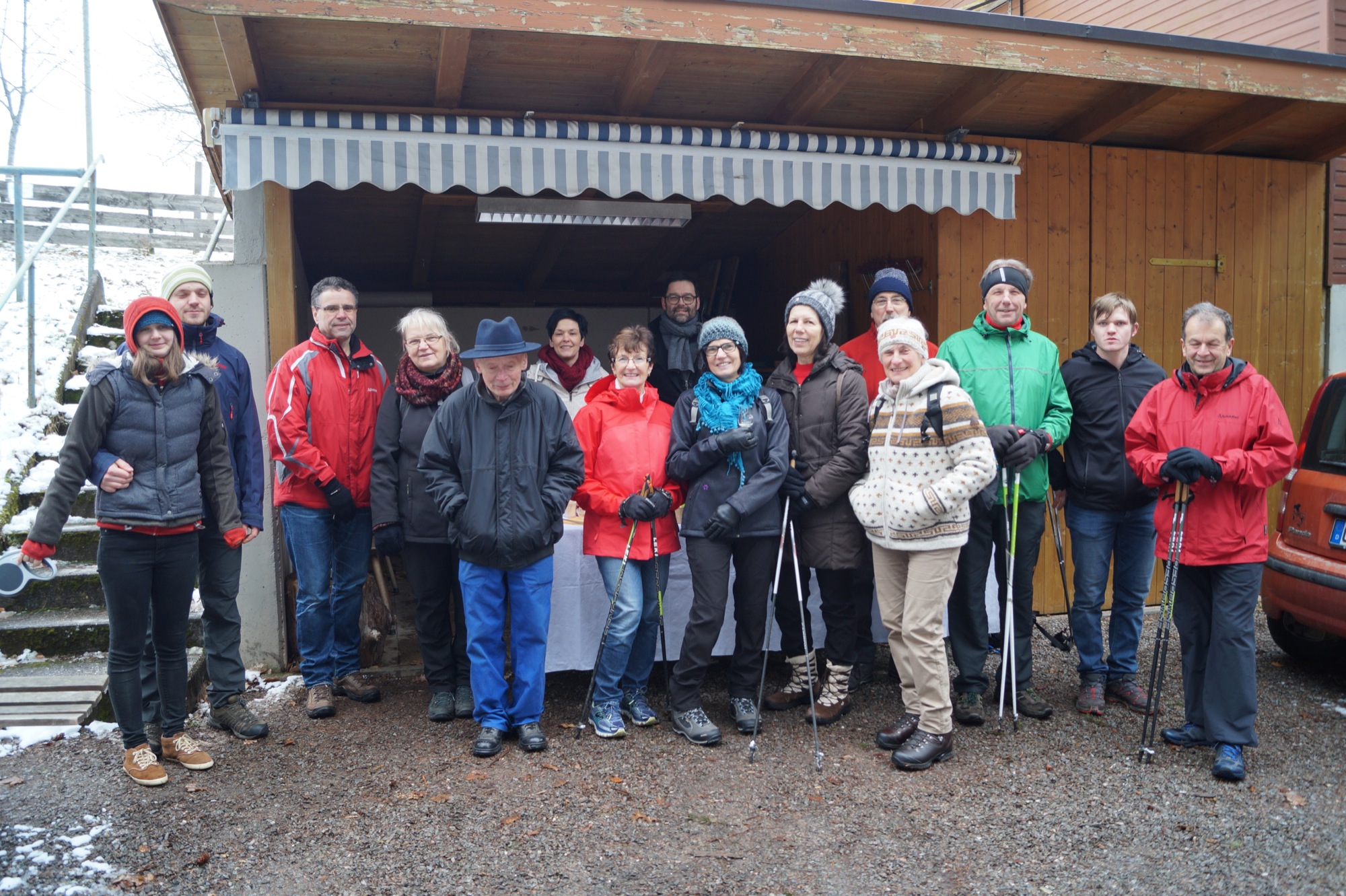 Über weniger bekannte Wald- und Wiesenwege oberhalb der Gotsched vorbei, ging es zum ersten, für viele überraschenden, kulinarischen Zwischenstopp bei der Störgeißhütte. Egbert Laifer hatte mit Tina Zimmerer ein kleines Büfett gezaubert, Augenweide und Gaumenfreude zugleich. Angepasst an die klirrende Kälte gab es vorweg ein warmes Kartoffelsüppchen mit Wursteinlage, gefolgt von einer frisch geräucherten Schwarzwälder Lachsforelle mit Baguette und Sahnemeerrettich, Rindersalami, Salamisticks, Kirschtomaten und verschiedenen Oliven; dazu wurde ein korrespondierender Weißwein, Glühwein oder etwas Alkoholfreies gereicht.