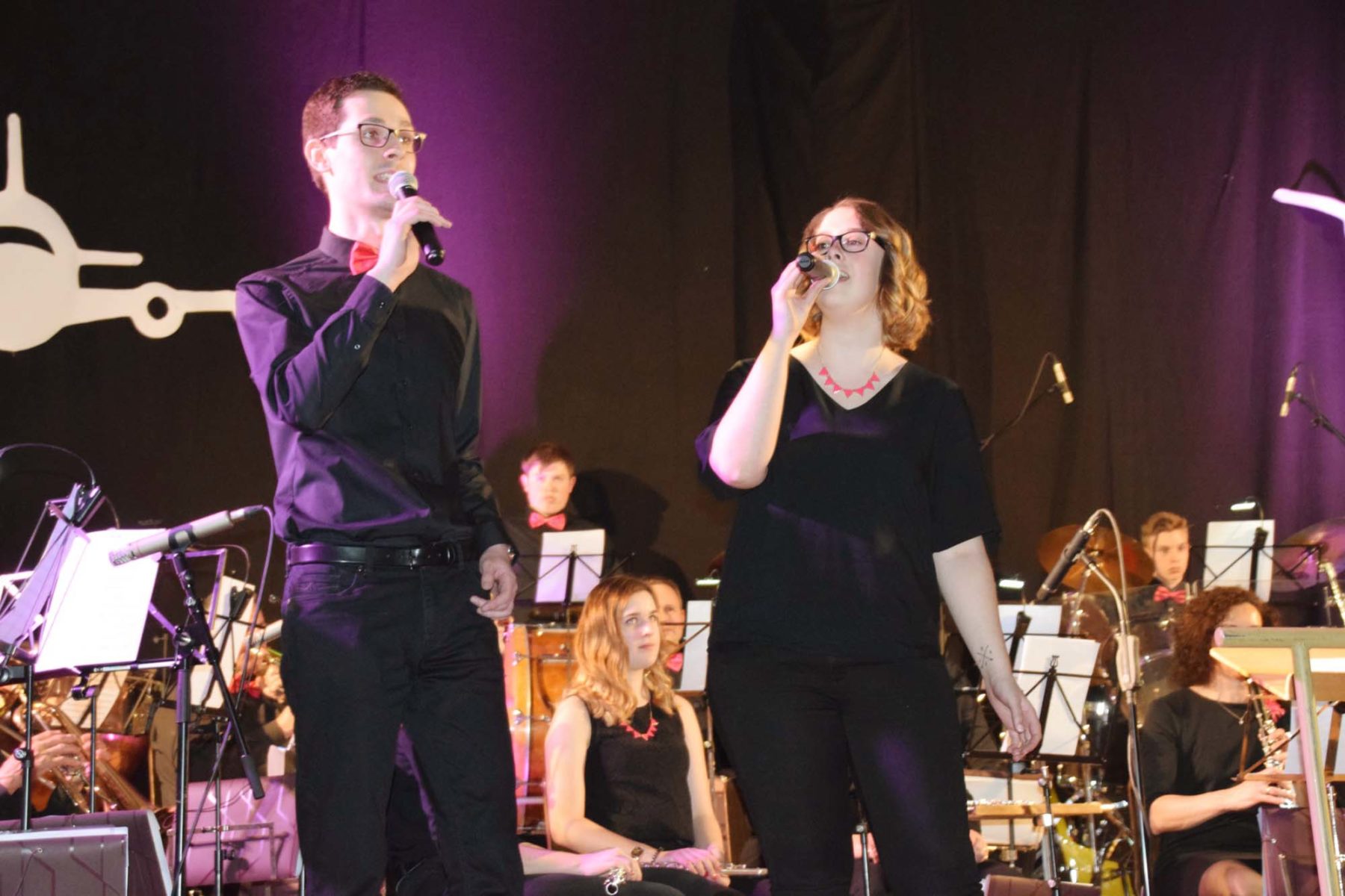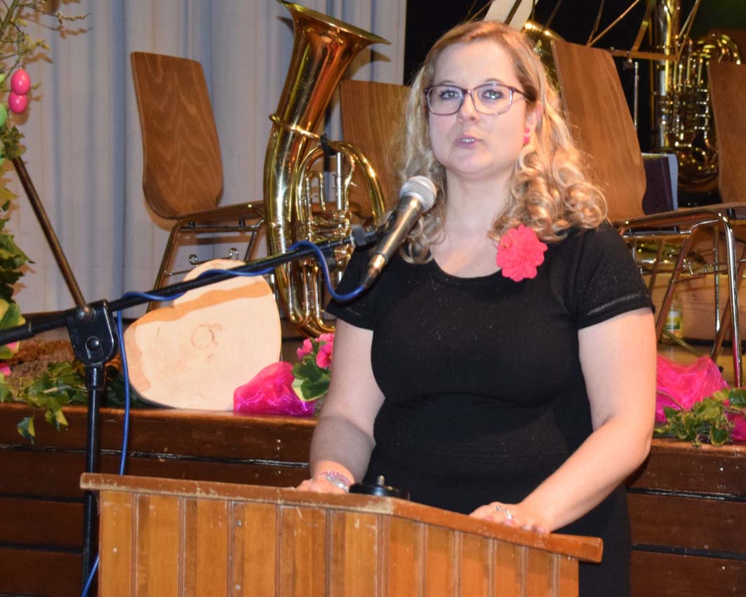 Melanie Junker begrüßte die zahlreichen Gäste in der Hansjakob-Halle und bat sie an Bord der »Pretty Pink Airline« zu einem dreistündigen Flug mit Kapitän Roland Weygold und seiner 30-köpfigen Crew. Mit zahlreichen Details zu den folgenden Musikstücken führte Melanie Junker gekonnt auch durch das weitere Programm.