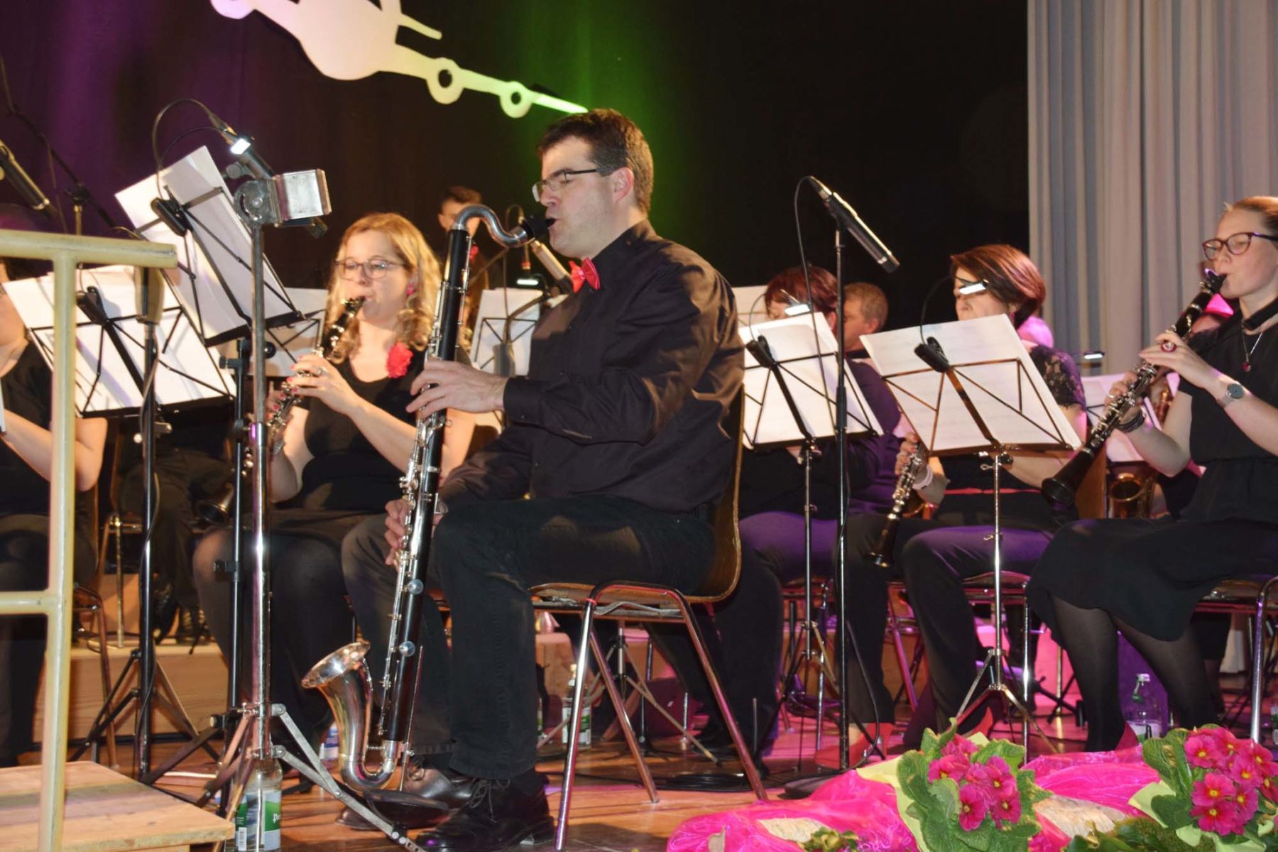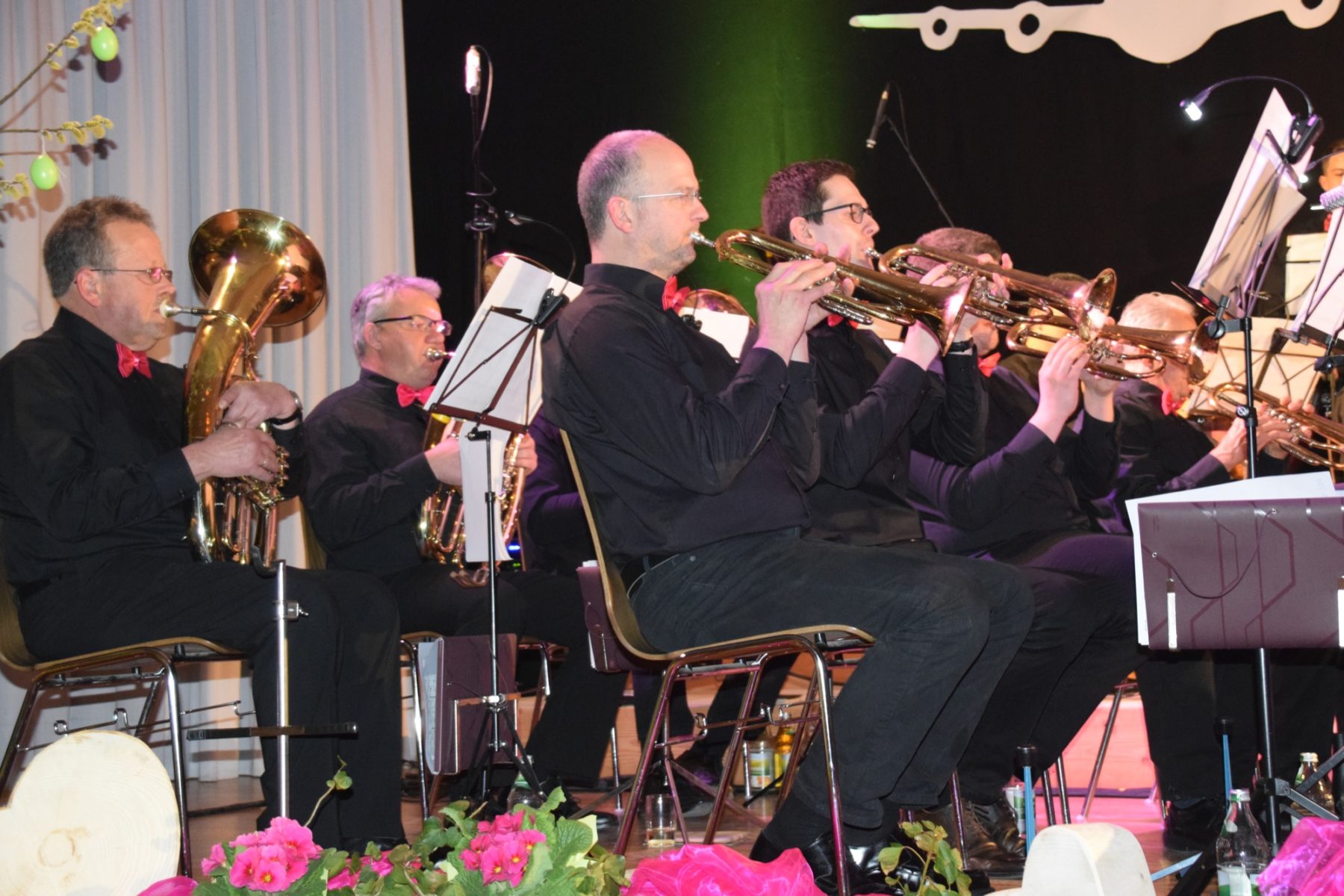 Foto: Herbert VollmerZwei weiße Flugzeuge der »Pretty Pink Airline« auf schwarzem Grund bildeten den Hintergrund der Bühne. Schwarz bekleidet waren auch die Musiker, bis auf kleine pinkfarbene Tupfer – Accessoires bei den Frauen und eine Fliege bei den Männern. Der ganze Saal war sehr ansprechend mit Frühlingsblumen geschmückt.