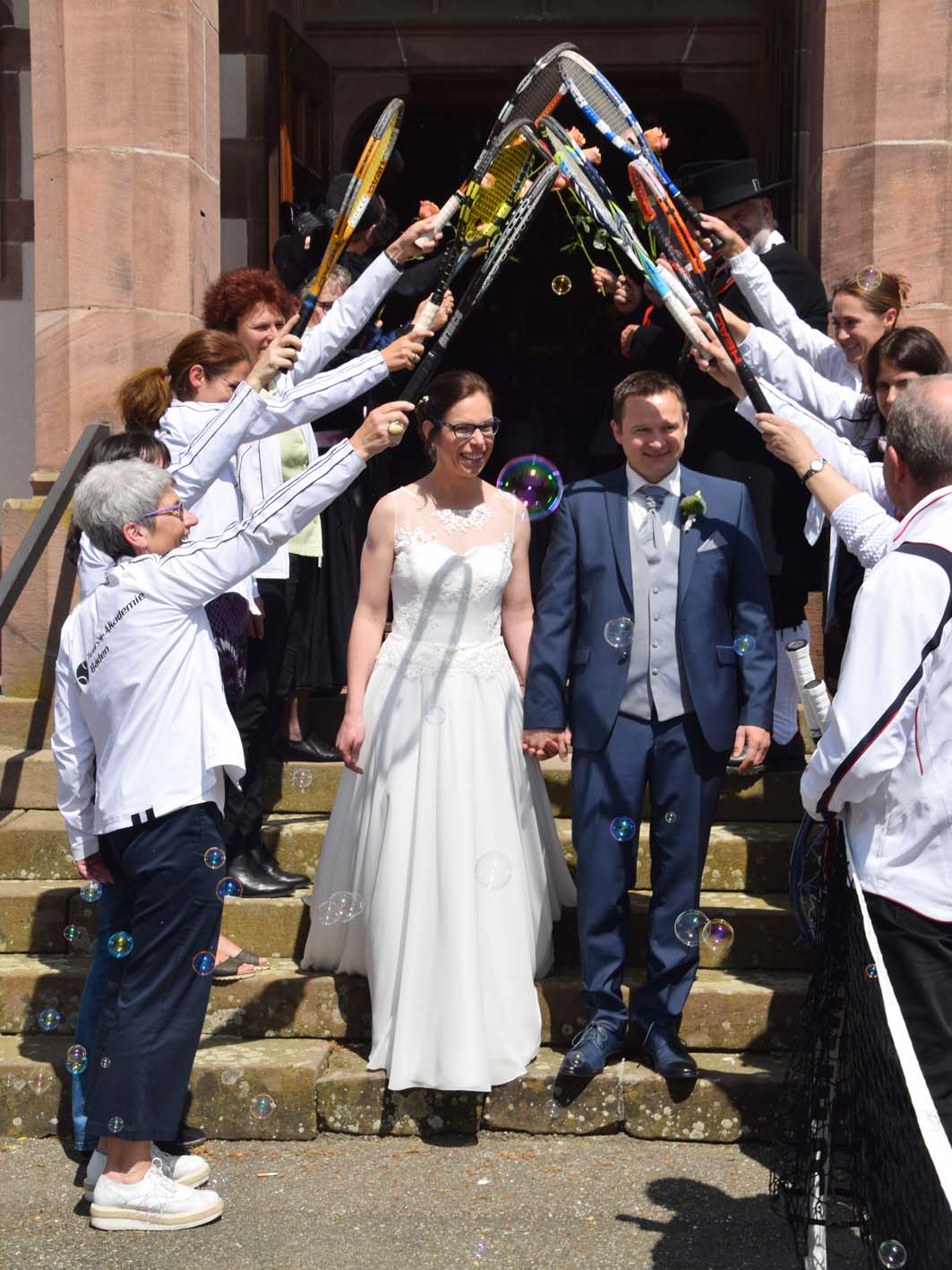 Nach dem Gottesdienst stand zunächst der Tennisclub Nordrach Spalier. Die Vereinskollegen des TV Unterharmersbach hatten für Diana und Michael Jung sportliche Hürden aufgebaut, die das Brautpaar problemlos meistern konnte. Abteilungsleiter Willi Lehmann gab den symbolischen Startschuss ins gemeinsame Eheleben. Ein gelungener Start für beide.