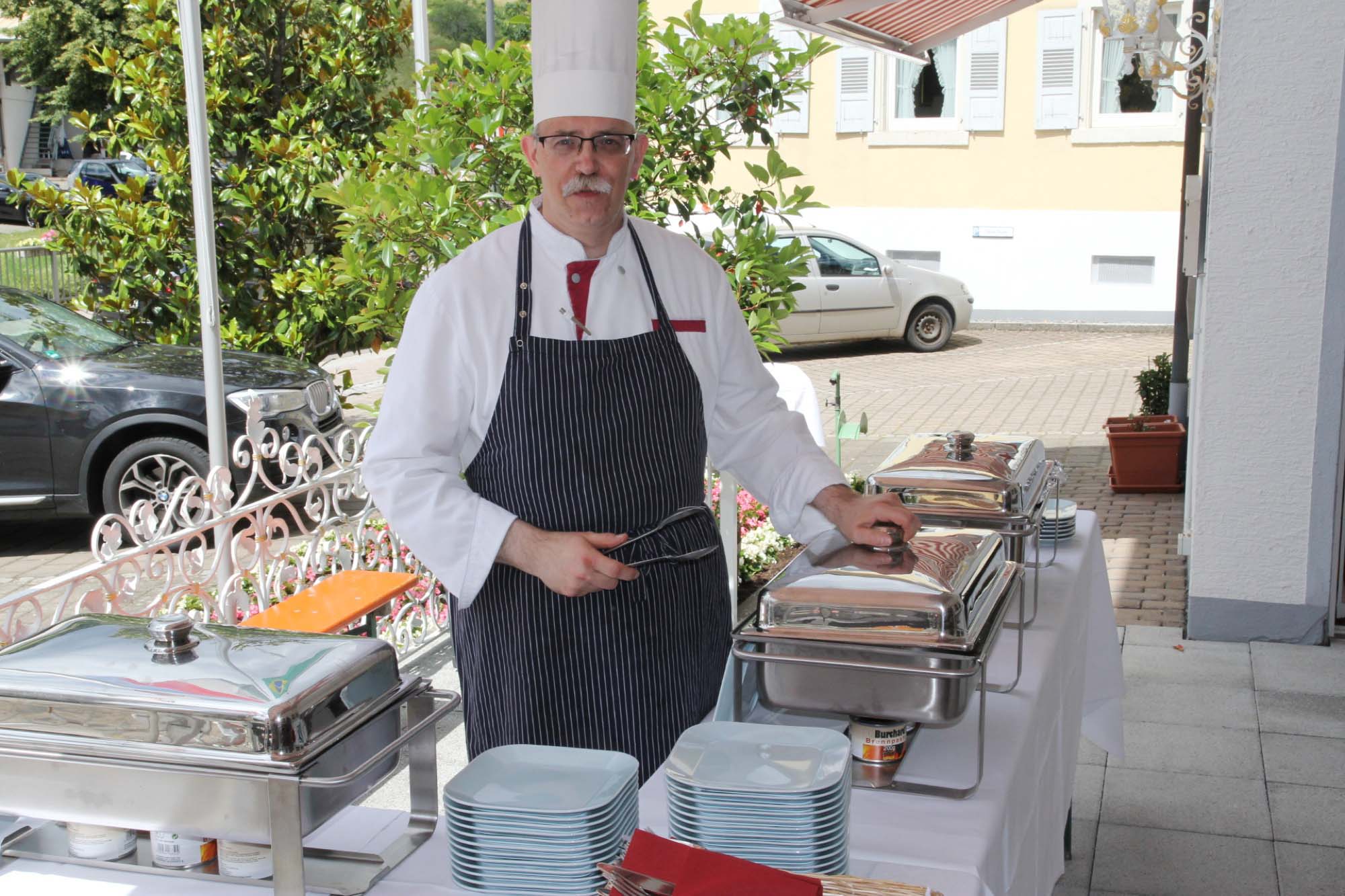 Küchenchef Andreas Waldschenk serviert Spanferkel zur Eröffnungsfeier. Foto: Firma Junker