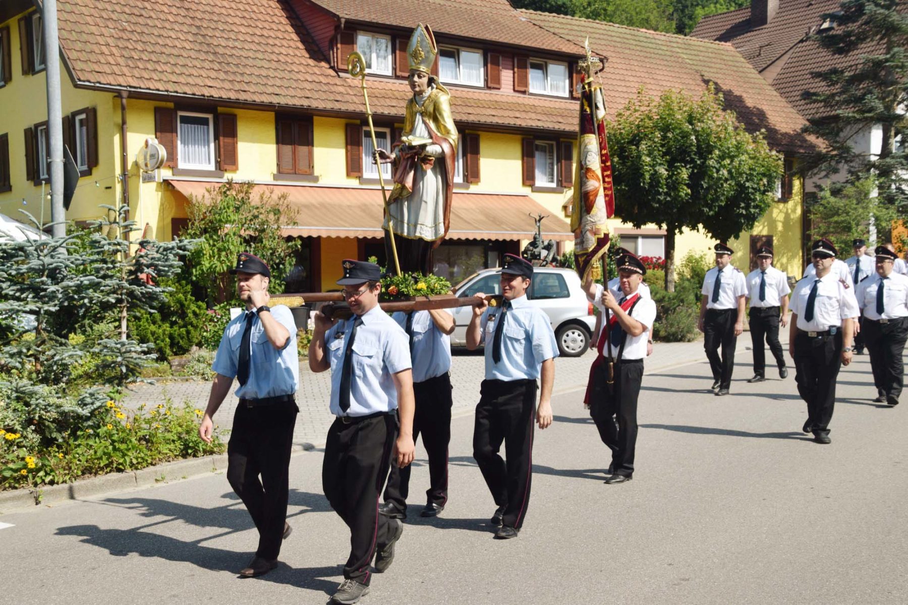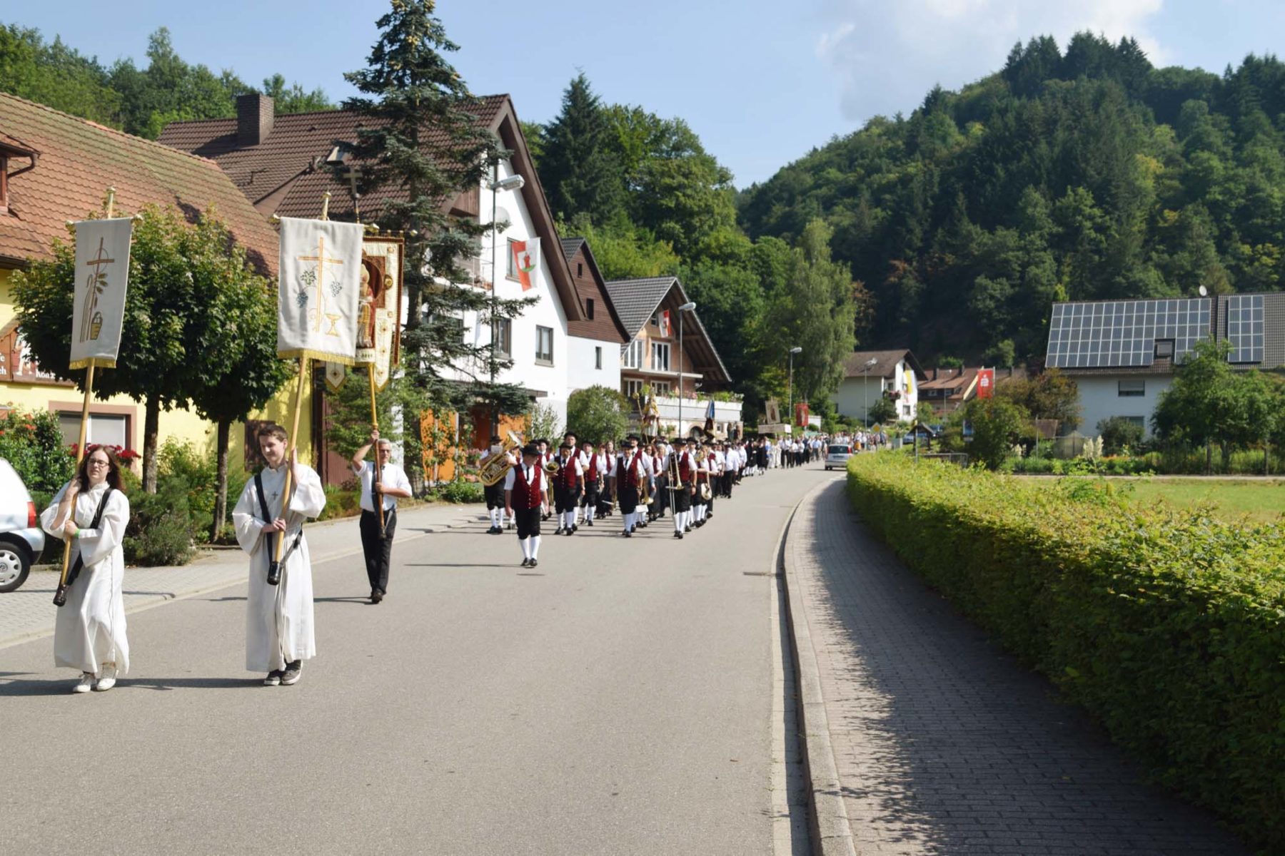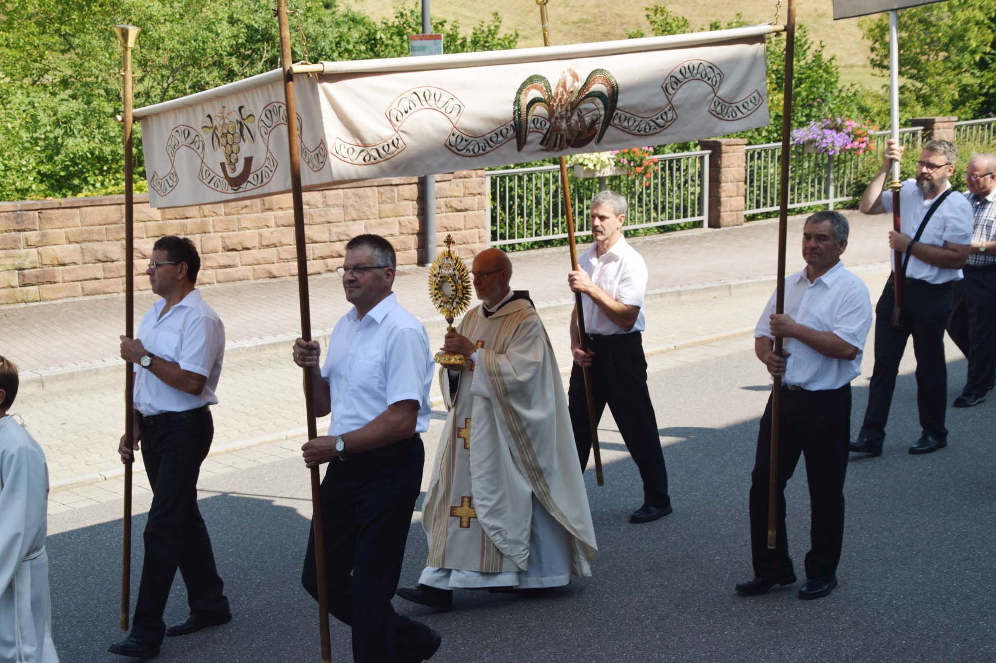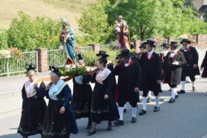 Nach der Rückkehr in die Pfarrkirche spendete Bruder Berthold allen den Segen. Der Gottesdienst endete mit dem Lied »Großer Gott, wir loben dich« zu den Klängen der Trachtenkapelle Nordrach. Bruder Pirmin dankte den teilnehmenden Vereinen sowie allen, die an Gottesdienst und Prozession einen Dienst übernommen hatten. Er lud alle ein, anschließend das weltliche Fest im Pfarrheim zu besuchen.