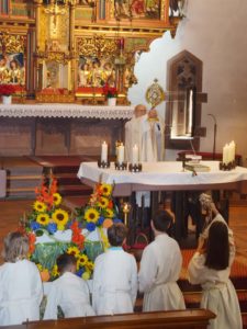 Die Sonne stand schon hoch am blauen Himmel, als um 9 Uhr Bruder Berthold und Bruder Pirmin mit Ministranten, Feuerwehr, Chor der Klänge, Kameradschaft und Trachtengruppe zu den Klängen der Trachtenkapelle in die Pfarrkirche einzogen. In seiner Predigt ging Bruder Berthold auf das Leben des Heiligen Ulrich ein, der 890 geboren wurde und fünfzig Jahre lang, von 923 bis 973, Bischof von Augsburg war. Bischof Ulrich habe enormen Anteil am Sieg von König Otto I bei der Schlacht auf dem Lechfeld gehabt, wo die Ungarn entscheidend besiegt werden konnten. Besonders habe er sich für die Missionsarbeit bei Klerus und Volk eingesetzt und die Armen unterstützt. Bruder Berthold forderte dazu auf, sich am Hl. Ulrich ein Beispiel zu nehmen, sich auch heute für den Glauben zu begeistern und den notleidenden Mitmenschen zu helfen. Der Chor der Klänge unter Leitung von Viktor Kraus umrahmte den Gottesdienst musikalisch.