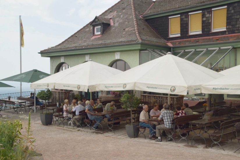 Der 668 Meter hohe Hausberg von Baden-Baden empfing die Senioren mit einem kurzen Regenschauer, ein in diesem Sommer fast schon einmaliges Erlebnis. Auf der Freiterrasse der Gaststätte Merkurstüble genossen die Senioren neben der schönen Aussicht auch Kaffee und Kuchen, Eisbecher und die sonstigen Angebote. Die meisten ließen es sich auch nicht nehmen, den kurzen Anstieg zum Turm zu bewältigen, um dann zu Fuß oder mit dem Fahrstuhl auf die 23 Meter hohe Aussichtsplattform zu gelangen. Die großartige Panoramaaussicht auf Baden-Baden, das Murgtal und die umliegenden Schwarzwaldberge bis zur Hornisgrinde entschädigte für diese Mühe. Nach Westen war die Sicht allerdings nicht besonders gut, vom Elsass und den Vogesen war gar nichts zu sehen. Dafür wagten sich einige Gleitschirmflieger in die Lüfte und umkreisten den Merkur, stets auf der Suche nach Aufwinden.