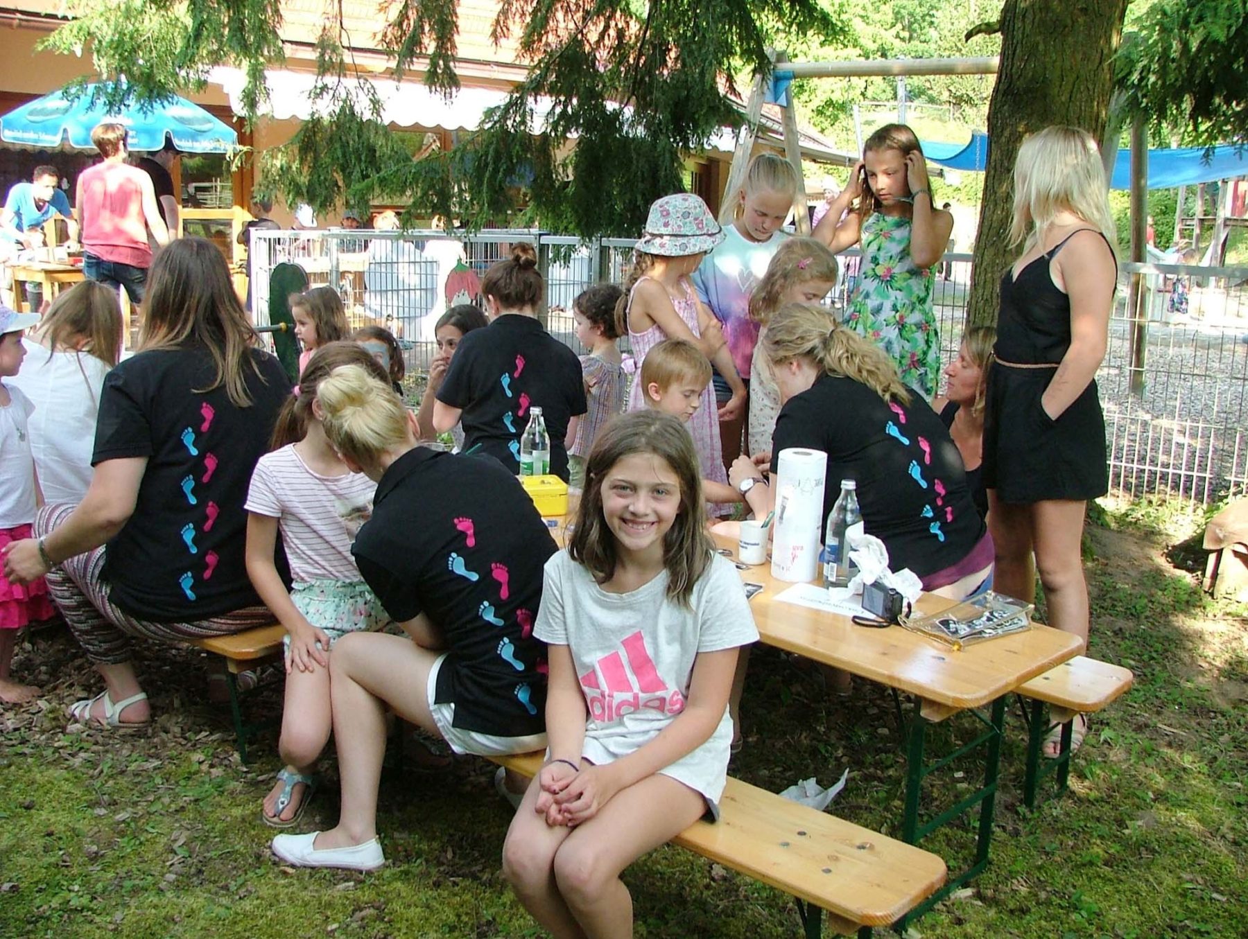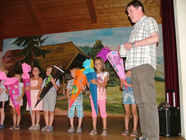 Foto: KindergartenNeben Waldwoche, Zahlenland, Zoo- und Polizeibesuch standen zum Ende des Kindergartenjahres noch weitere Highlights für die künftigen Erstklässler an. Auf dem Pfarrfest stellten sie ihr tänzerisches Können unter Beweis. Nach dem gemeinsamen Begrüßungslied »Bin ich aufgewacht und die Sonne lacht«, ließen die Kinder mit dem Tanz »Wir tanzen Samba, Rumba, ChaChaCha« die Bühne im Pfarrheim wackeln. »Kein erster Schultag ohne Schultüte«, unter diesem Motto bekamen die zukünftigen Schüler ihre Schultüten überreicht. Bruder Pirmin segnete die Kinder sowie deren Schultüten und übermittelte die besten Wünsche für die bevorstehende Schulzeit. Ein weiteres Ereignis war dann die Familienfeier mit den vielen Workshops im Kindergarten. An den Stationen gab es neben der Herstellung lustiger Troll-, Drachen- oder Elfenmasken auch eine Station mit Kinderschminken und tollen Glitzertattoos. Besonders beliebt war auch die Station, an welcher die Kinder einen Schlüsselanhänger aus Holz anfertigen konnten. Wie schnell ein Armband oder Haarschmuck entsteht, erlebten die Kinder an der vorletzten Station. Durch spielerische Schwungübungen konnte augenblicklich ein Schmuckstück in den Lieblingsfarben hergestellt werden. An der nächsten Station, der Holzwerkstatt, fanden nicht nur die Jungs, sondern auch ganz besonders die Mädchen ihren Spaß beim freien Werkeln unter fachkundiger Aufsicht. Lustige Bilder für die ganze Familie entstanden schließlich an der letzten Station, der Fotobox. Bei sommerlichen Temperaturen durfte natürlich auch der Eiswagen »Venezia« nicht fehlen. Eine Stärkung fanden dann schließlich alle am reichhaltigen Buffet und der Getränketheke. Hier wünscht sich das Kindergartenteam viele helfende Hände aus der Elternschaft, damit auch künftig eine Bewirtung bei Festlichkeiten angeboten werden kann.