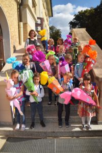 Nun wurde ein roter Teppich ausgerollt – es war nur ein kleiner, runder Teppich – und die Erstklässler gingen über diesen Teppich, begleitet von lautem Klatschen, zusammen mit ihrer Klassenlehrerin Melanie Psak-Mengdehl in ihr Klassenzimmer »zur ersten Unterrichtsstunde«. Der Elternbeirat hatte Kaffee und Kuchen vorbereitet, so dass die Wartezeit bis zum Ende der »ersten Schulstunde« gut überbrückt werden konnte.