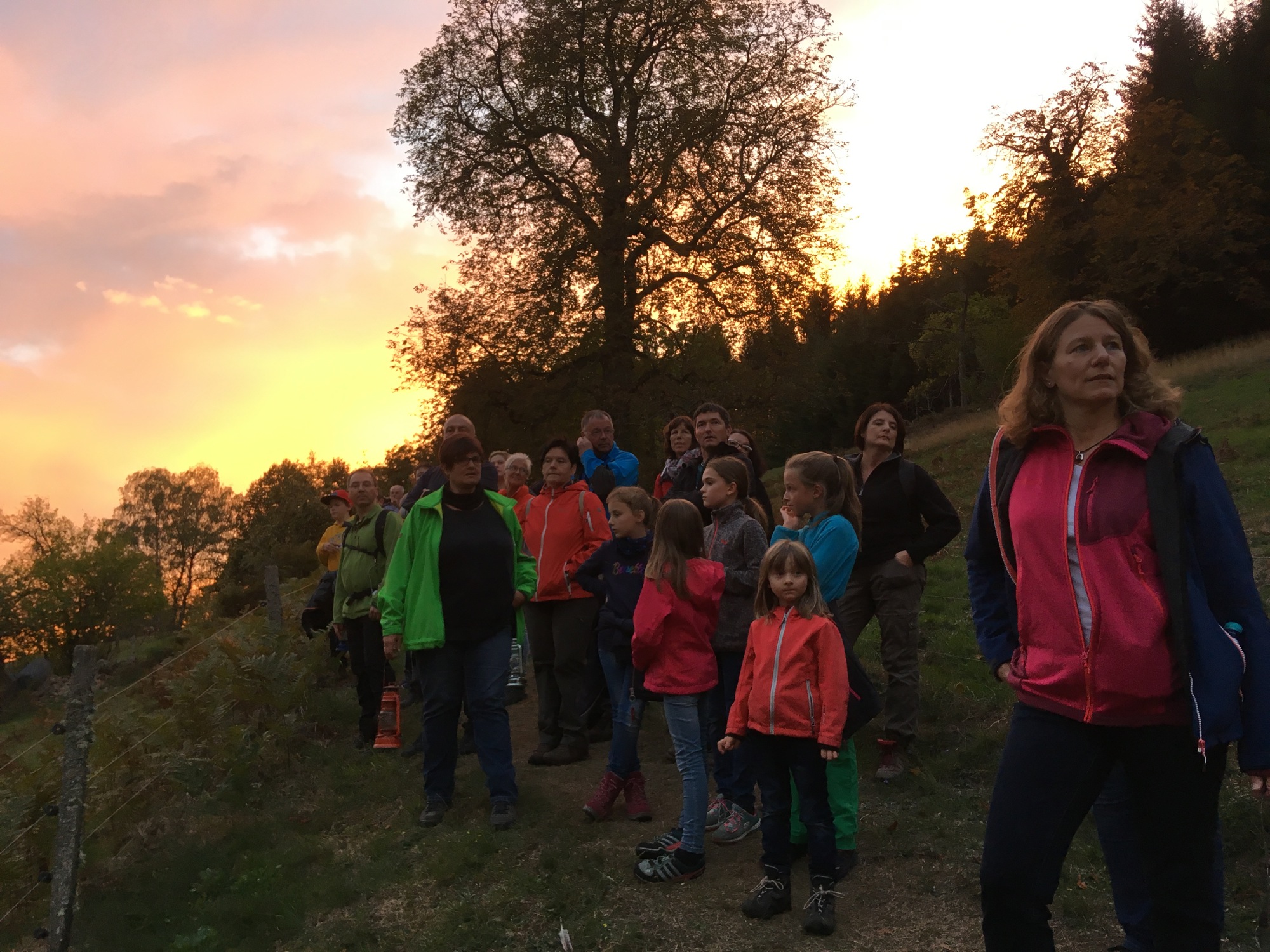 Wanderführerin Sabine Boschert begrüßte die Gäste und gab erste Anweisungen, wie man sich am besten verhalte, sollte die Gruppe wirklich dem Moospfaff begegnen. Ausgestattet mit Laternen begab sich die Gruppe sodann auf die Wanderung in Richtung Moos, dem Gebiet, in dem der Moospfaff fast schon regelmäßig zu finden ist. Steil ging es zunächst hinauf bis auf die Höhe des Sonnenhauses. Unterwegs erzählte Sabine Boschert immer wieder Historisches und Interessantes zum Leben in der Kolonie und die Bedeutung, die der Moospfaff in ihrer Kindheit hatte und die sich bis heute eingeprägt hat.