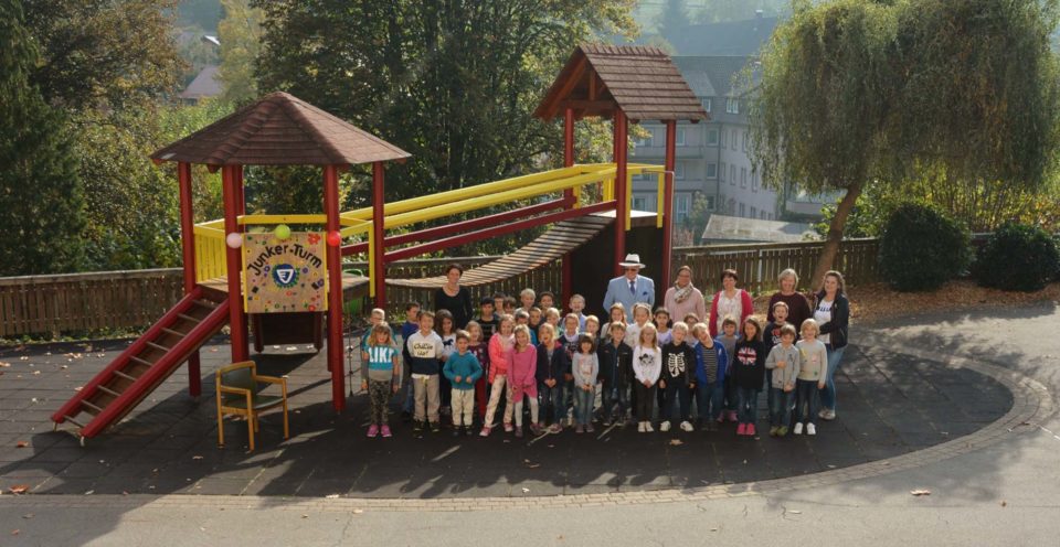 Fabrikant Erwin Junker machte sich am Freitag selbst ein Bild von dem Spielgerät, das nun wieder im neuen Glanz erstrahlt. Er hatte vor etlichen Jahren den Kletterturm komplett gestiftet und sich prompt um die Sanierung gekümmert, als ihn der Hilferuf aus der Schule erreichte.